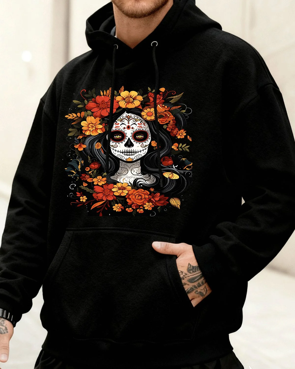 Day of the Dead Floral Skull Summer Cozy Graphic Hoodie-Vintage Artistic,Long Sleeve,Soft Fabric,Comfortable Fit