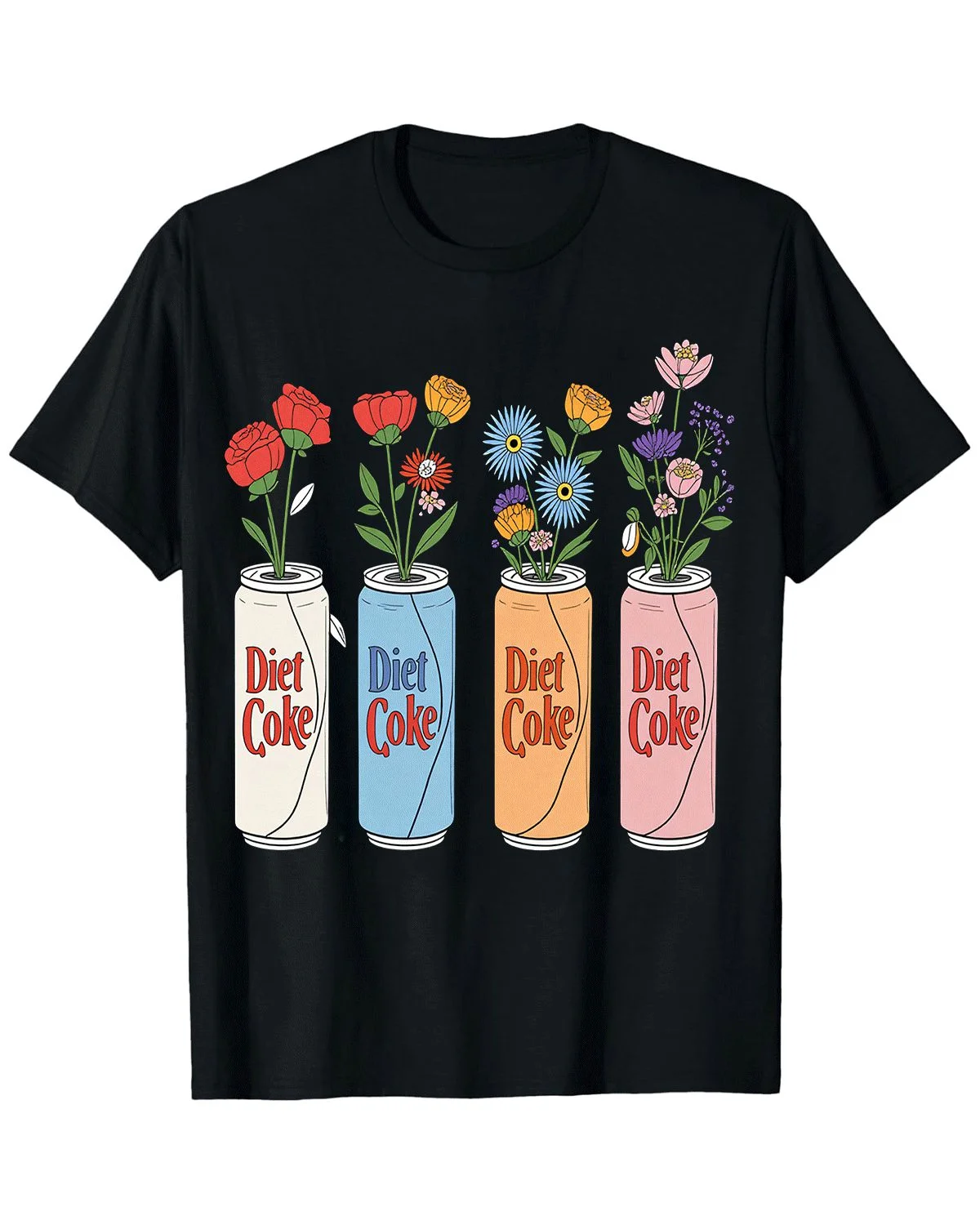 Diet Coke Floral Cans Summer Cotton Graphic T Shirt - Casual Vintage, Short Sleeve, Soft Fabric, Comfortable Fit