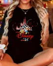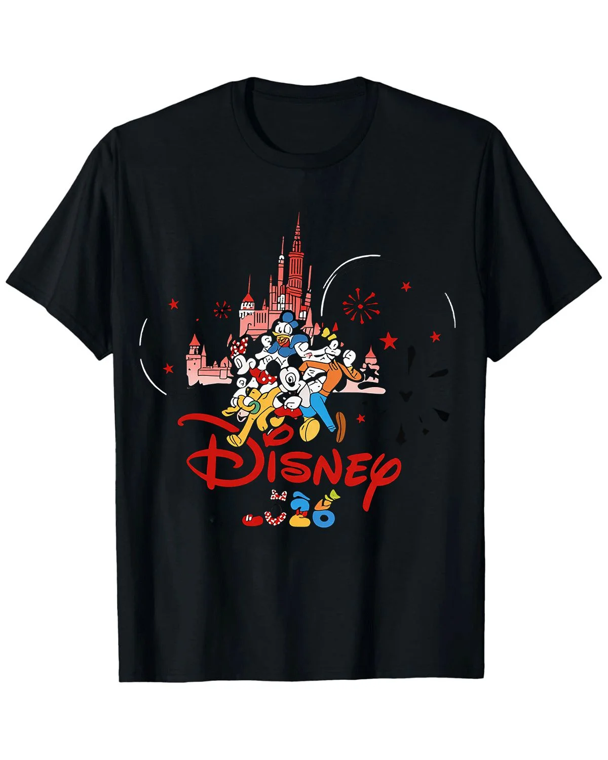 Disney Castle Characters New Year Celebration Summer Cotton Graphic T Shirt - Casual Vintage, Short Sleeve, Soft Fabric, Comfortable Fit