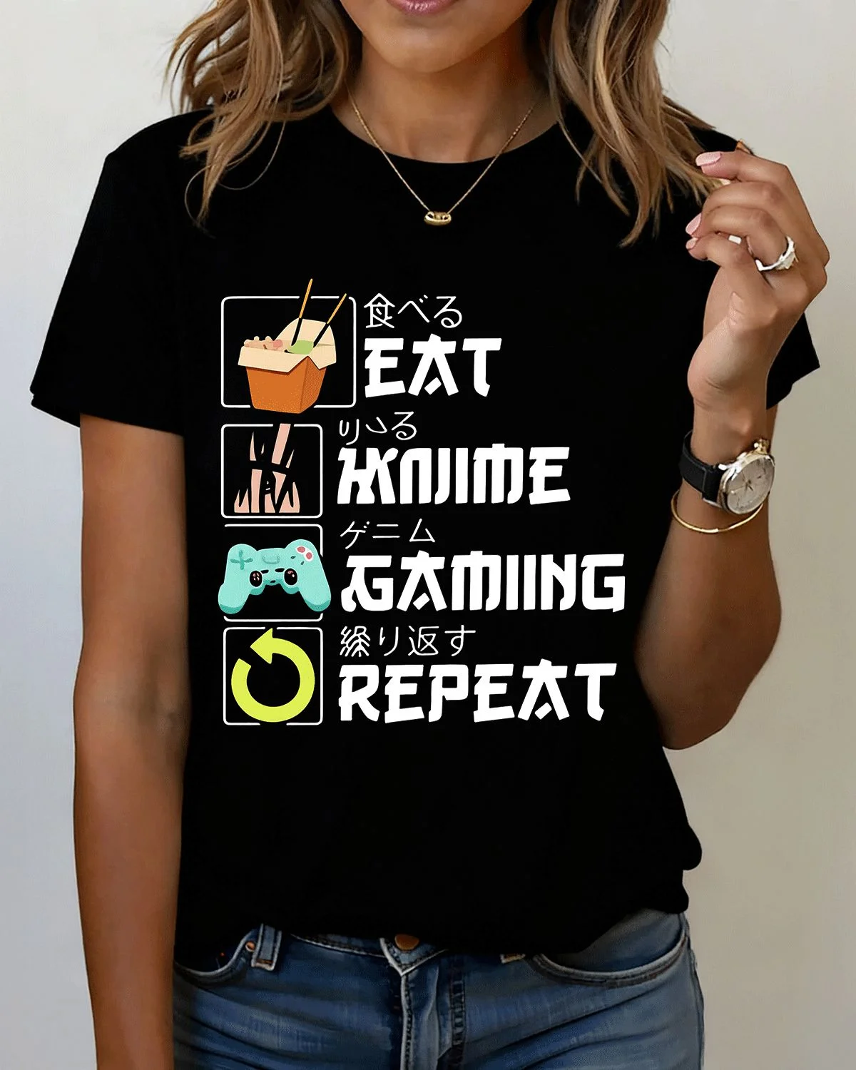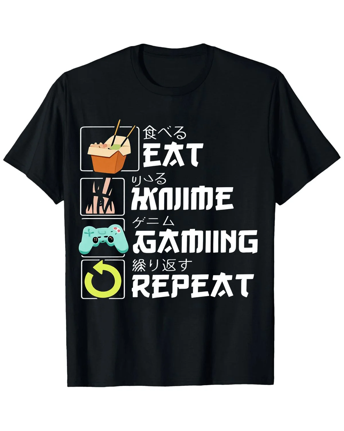 Eat Anime Gaming Repeat Summer Cotton Graphic T Shirt - Casual Cool, Short Sleeve, Soft Fabric, Comfortable Fit