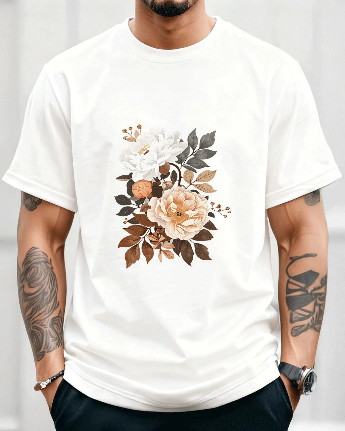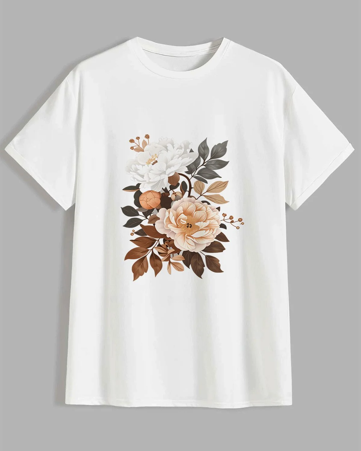 Elegant White and Peach Peony Floral Summer Cotton Graphic T Shirt - Vintage Artistic,Short Sleeve,Soft Fabric,Comfortable Fit