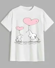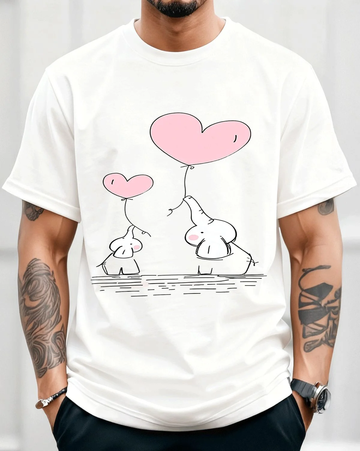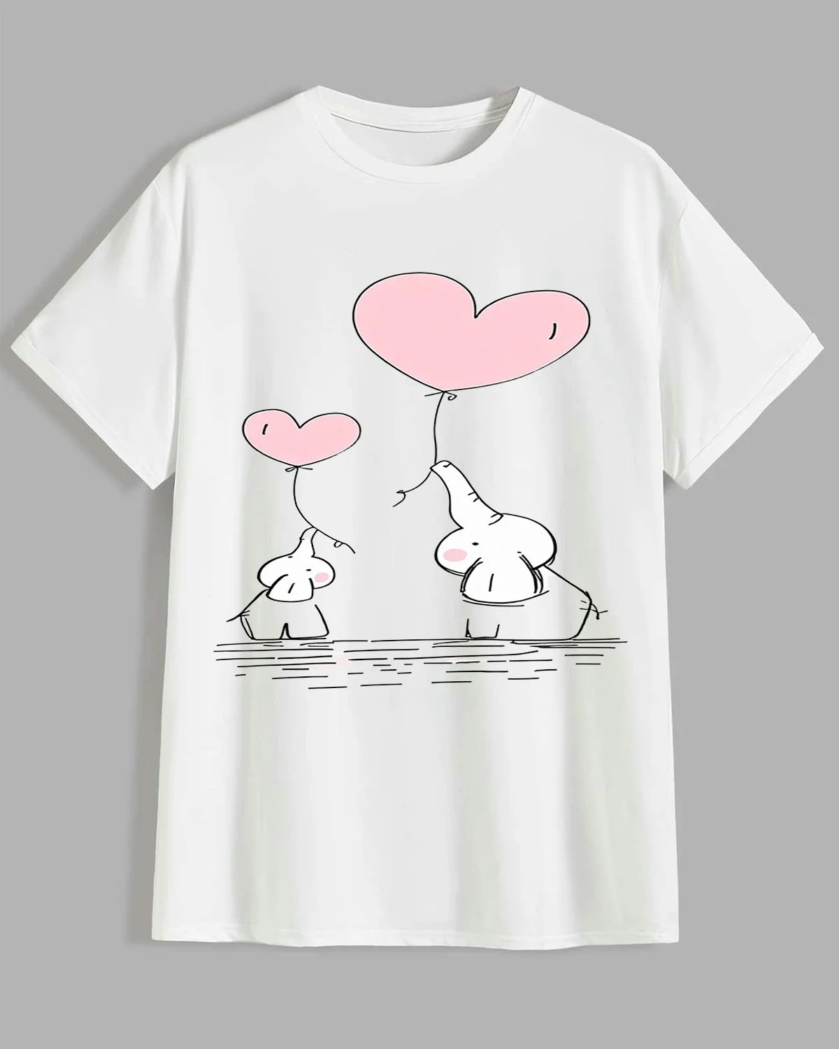 Elephants with Pink Heart Balloons Summer Cotton Graphic T Shirt - Casual Cute, Short Sleeve, Soft Fabric, Comfortable Fit