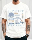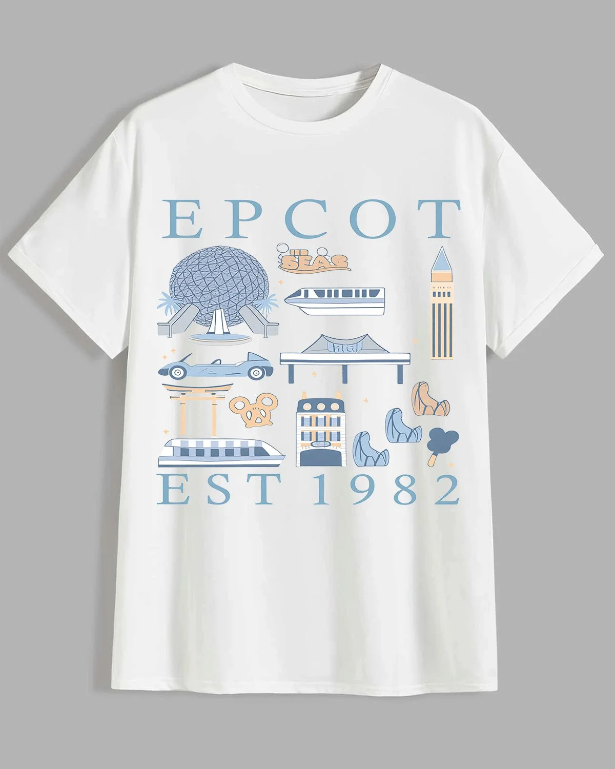 Epcot EST 1982 Icons Summer Cotton Graphic T Shirt - Vintage Retro, Short Sleeve, Soft Fabric, Comfortable Fit