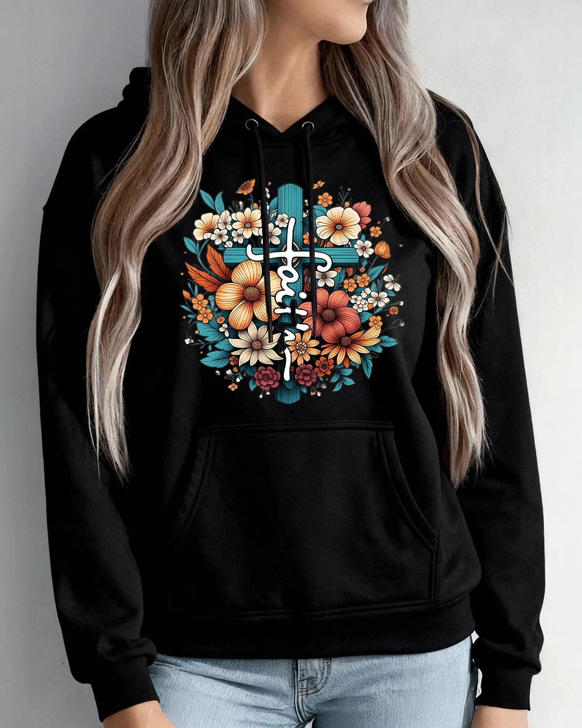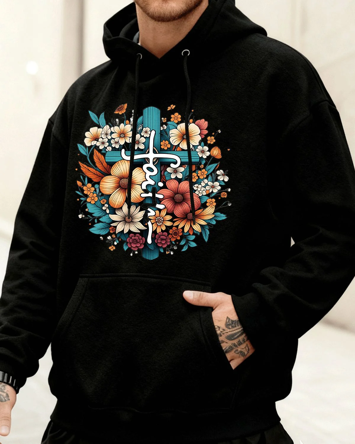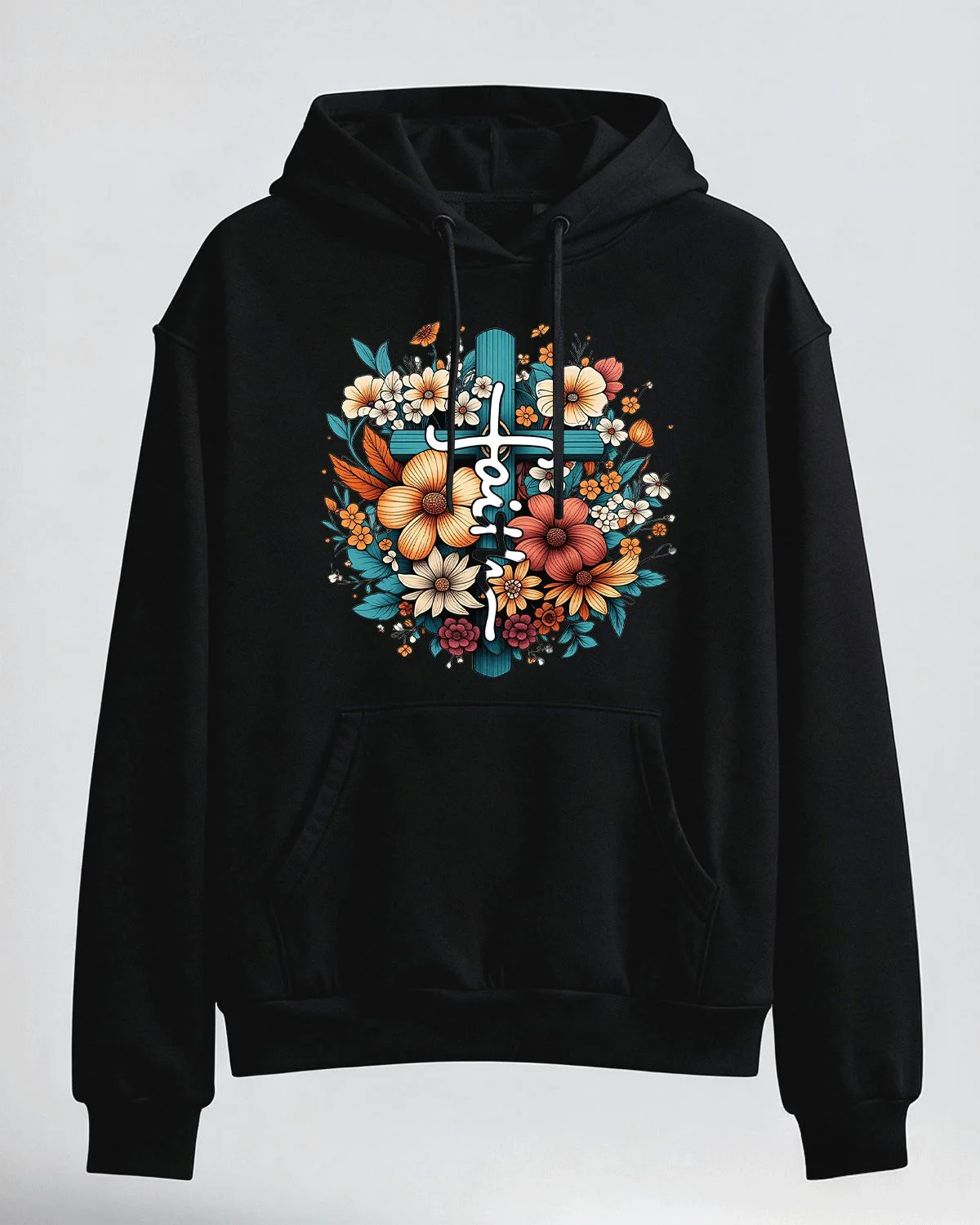 Faith Cross and Colorful Floral Bouquet Cozy Graphic Hoodie for Men and Women - Vintage Artistic, Long Sleeve, Soft Fabric, Comfortable Fit