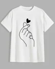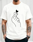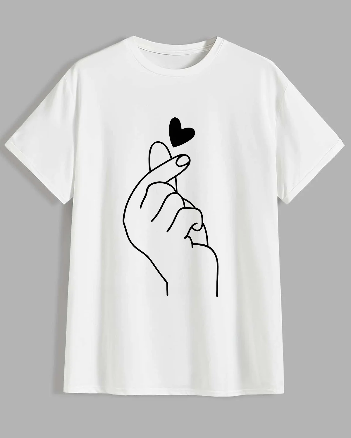 Finger Heart Line Art Summer Cotton Graphic T Shirt - Casual Artistic, Short Sleeve, Soft Fabric, Comfortable Fit