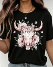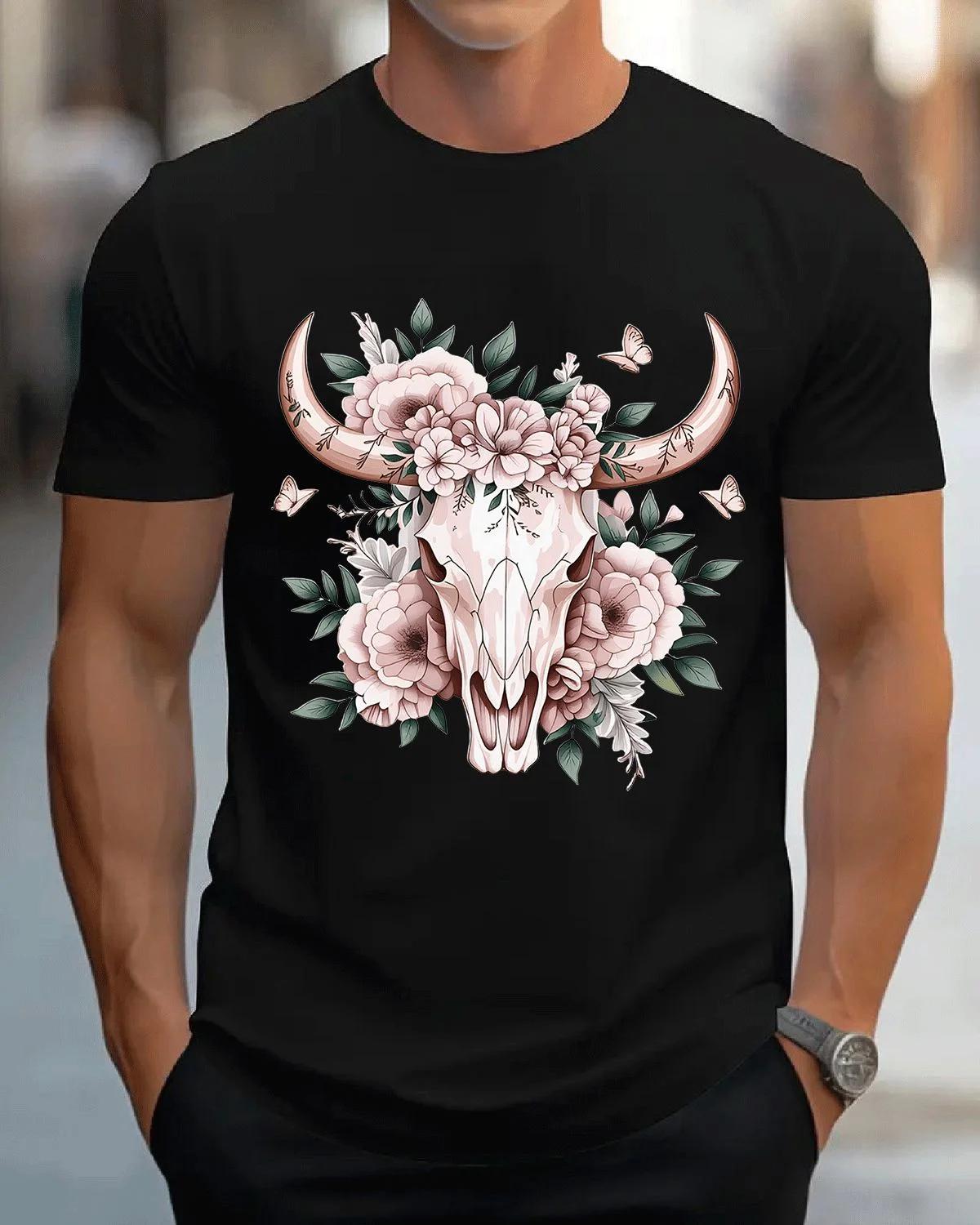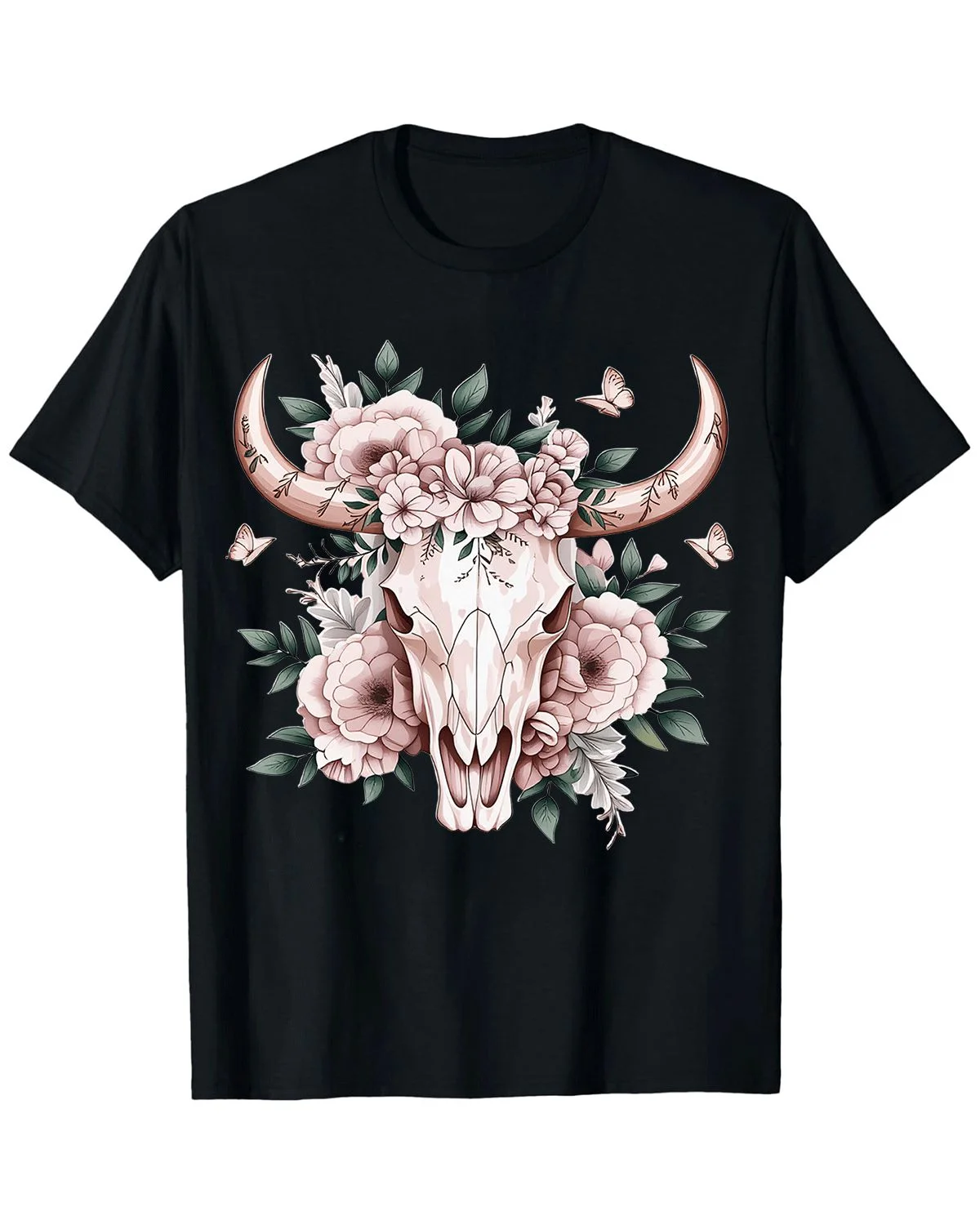 Floral Bull Skull with Butterflies Summer Cotton Graphic T Shirt - Boho Vintage, Short Sleeve, Soft Fabric, Comfortable Fit