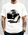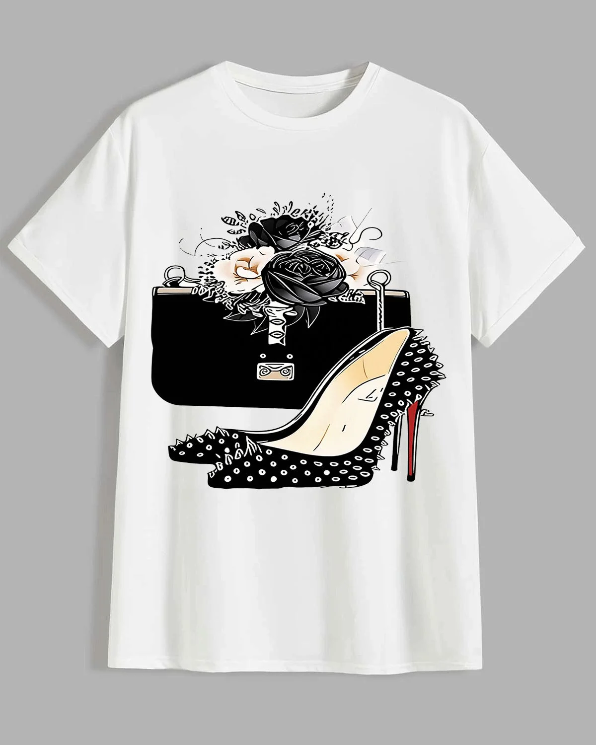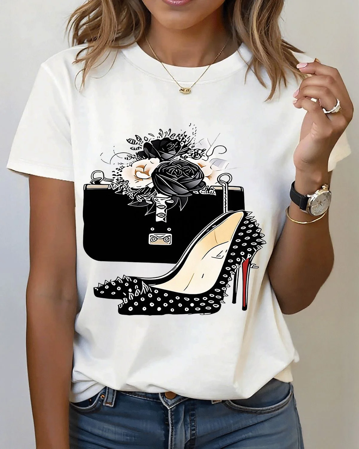 Floral Handbag and Studded High Heel Summer Cotton Graphic T Shirt - Chic Vintage, Short Sleeve, Soft Fabric, Comfortable Fit