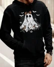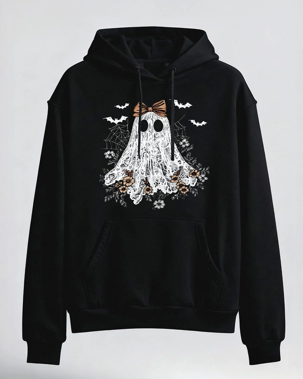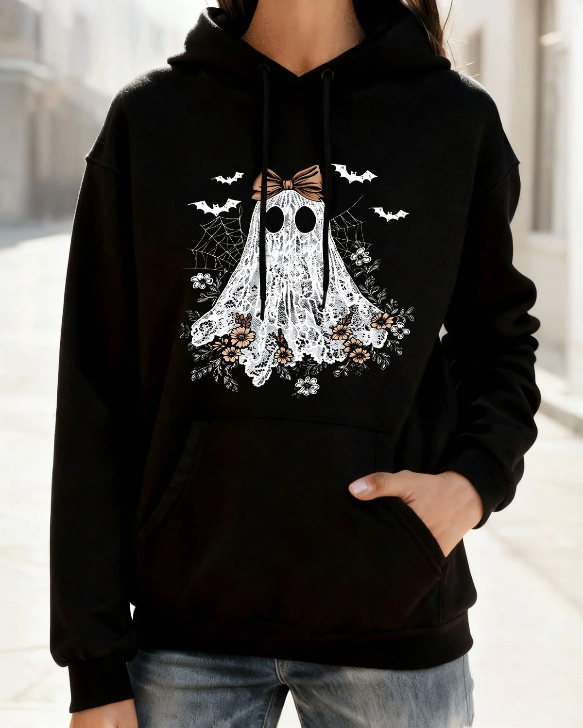 Floral Lace Ghost Halloween Summer Cozy Graphic Hoodie-Vintage Artistic,Long Sleeve,Soft Fabric,Comfortable Fit