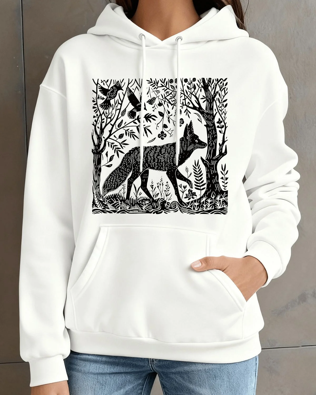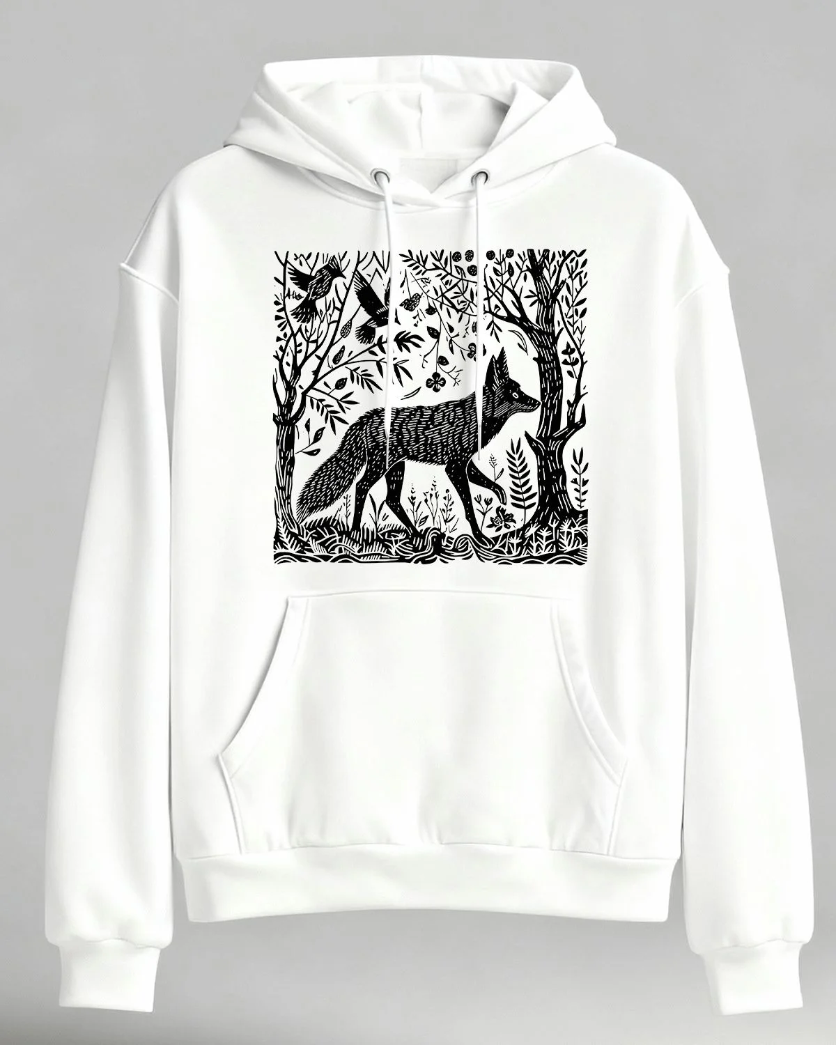 Fox in Forest Woodland Scene Cozy Graphic Hoodie for Men and Women - Vintage Artistic, Long Sleeve, Soft Fabric, Comfortable Fit