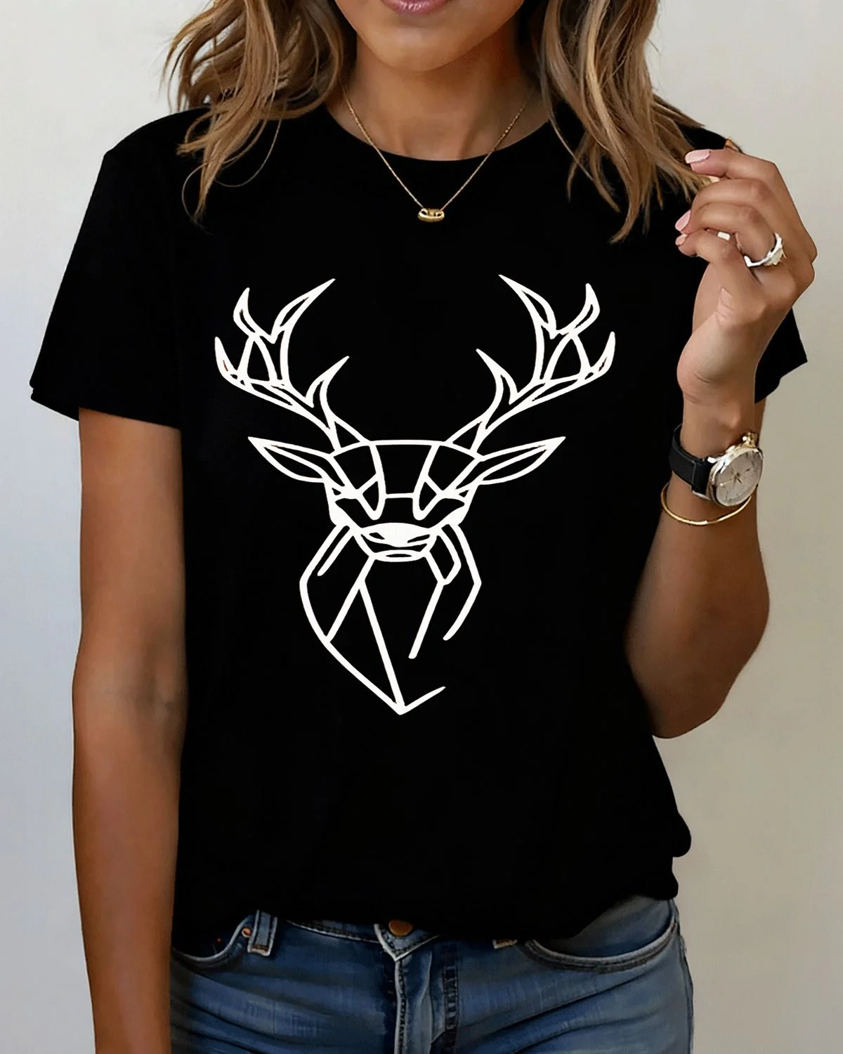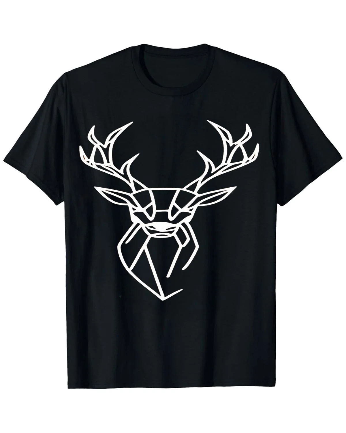 Geometric Deer Head Outline Summer Cotton Graphic T Shirt - Artistic Modern, Short Sleeve, Soft Fabric, Comfortable Fit