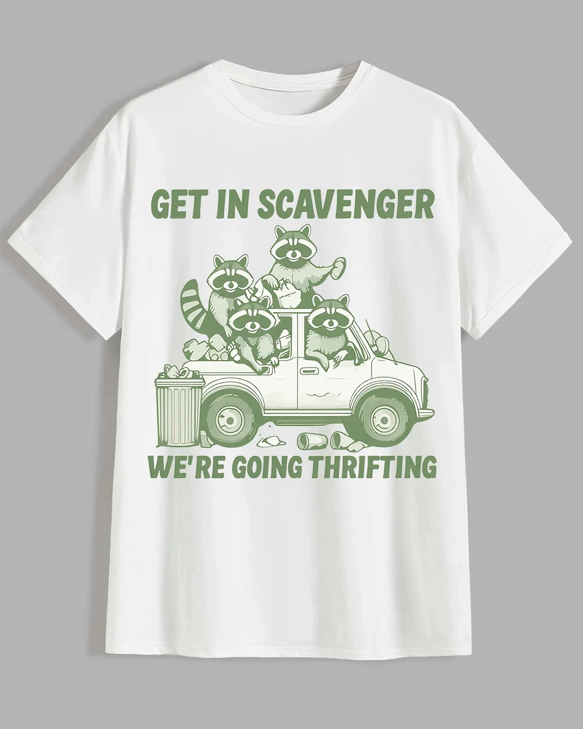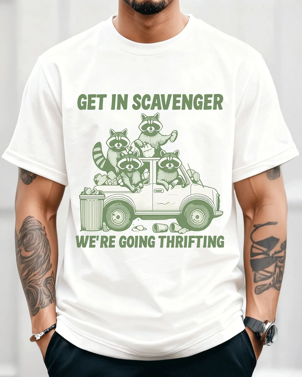 Get In Scavenger Thrifting Raccoons Summer Cotton Graphic T Shirt - Casual Funny, Short Sleeve, Soft Fabric, Comfortable Fit