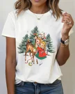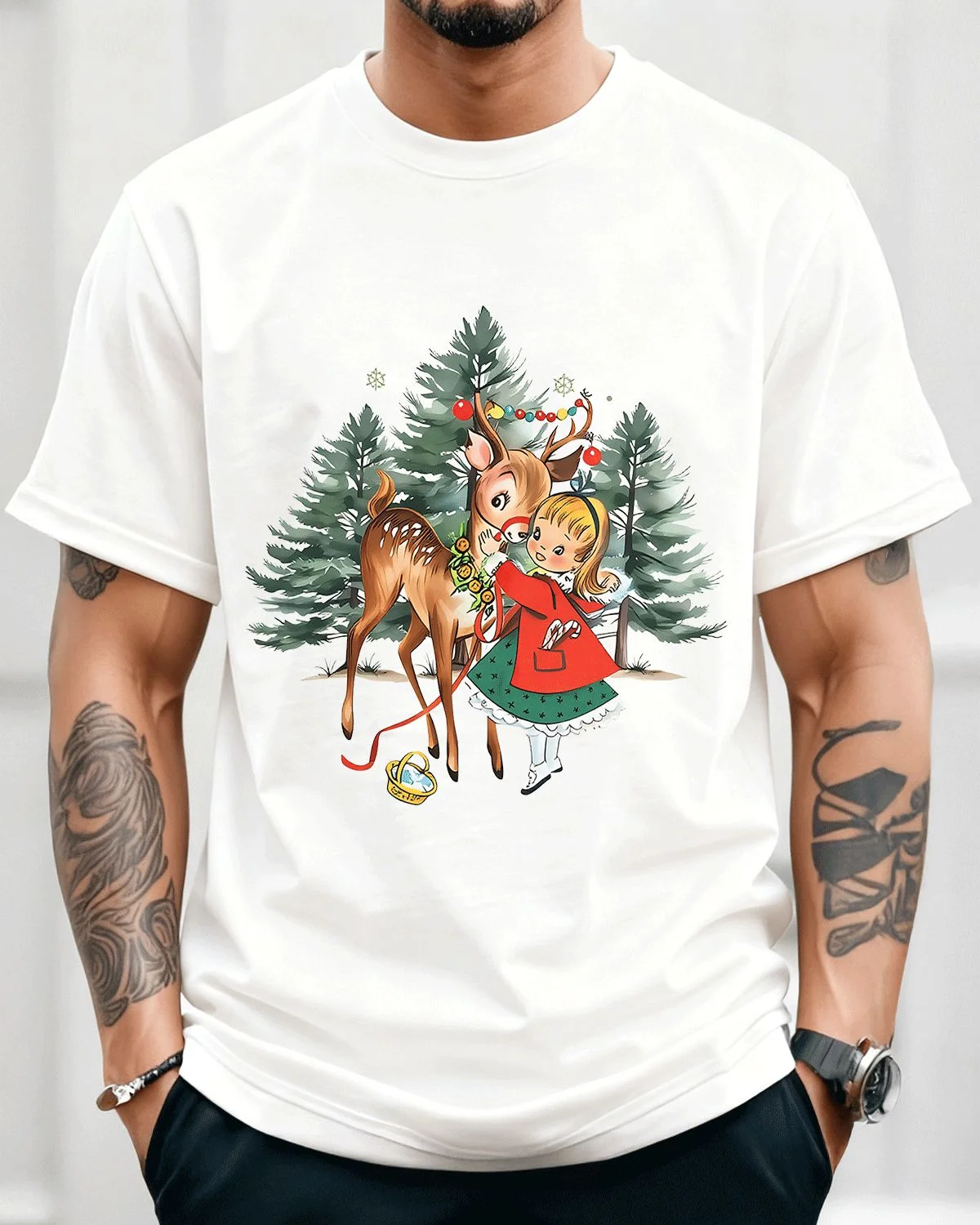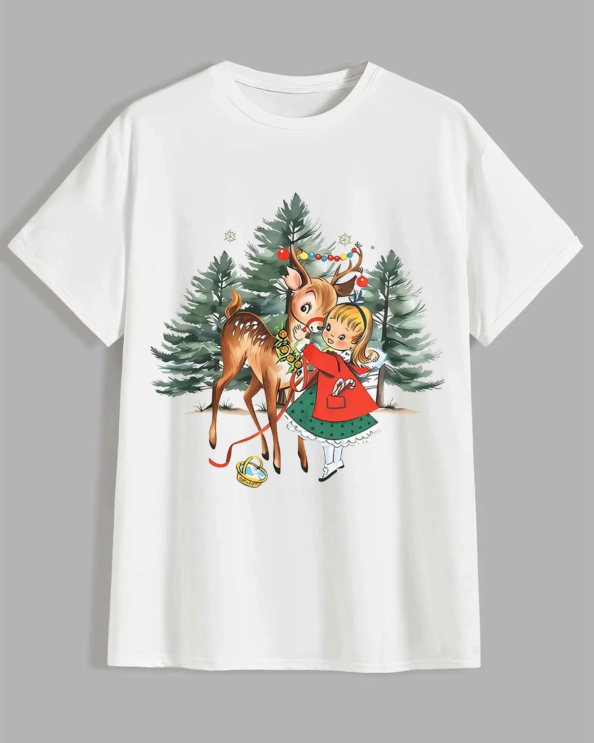 Girl and Reindeer Winter Forest Scene Summer Cotton Graphic T Shirt - Vintage Artistic,Short Sleeve,Soft Fabric,Comfortable Fit