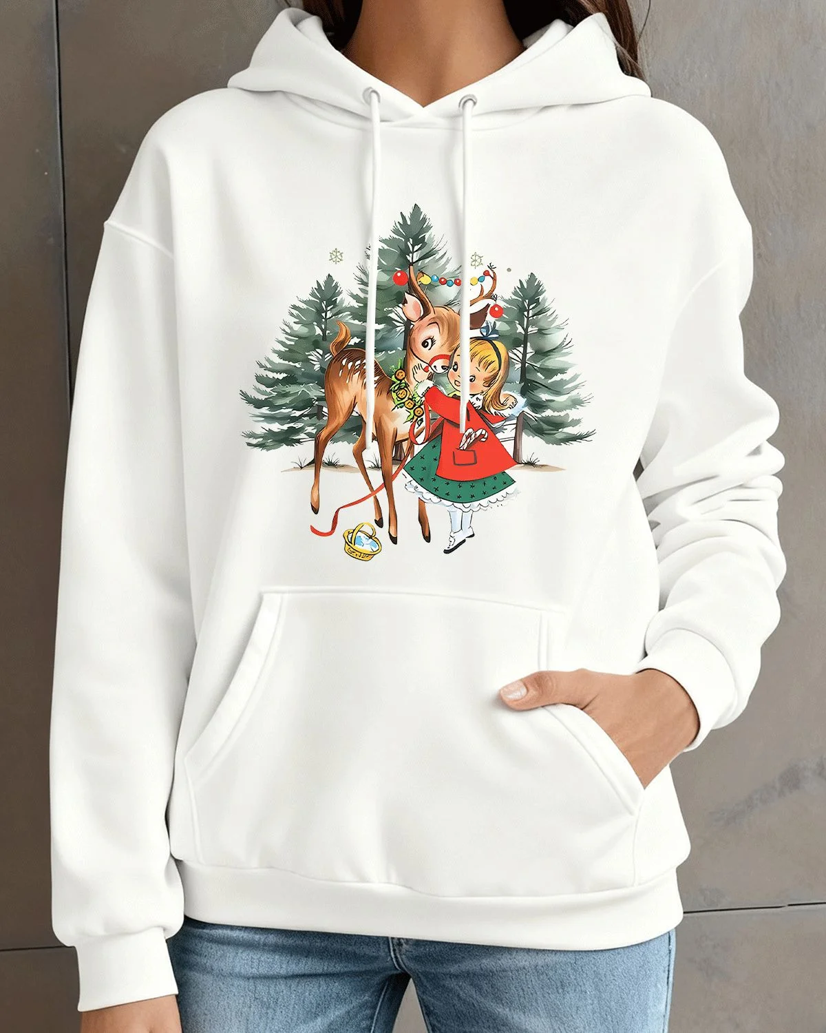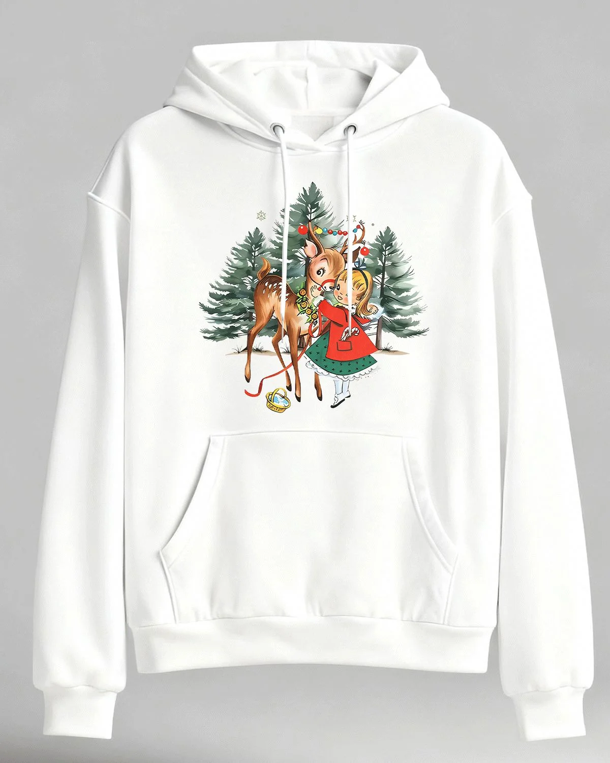 Girl and Reindeer Winter Forest Scene Summer Cozy Graphic Hoodie - Vintage Artistic, Long Sleeve, Soft Fabric, Comfortable Fit