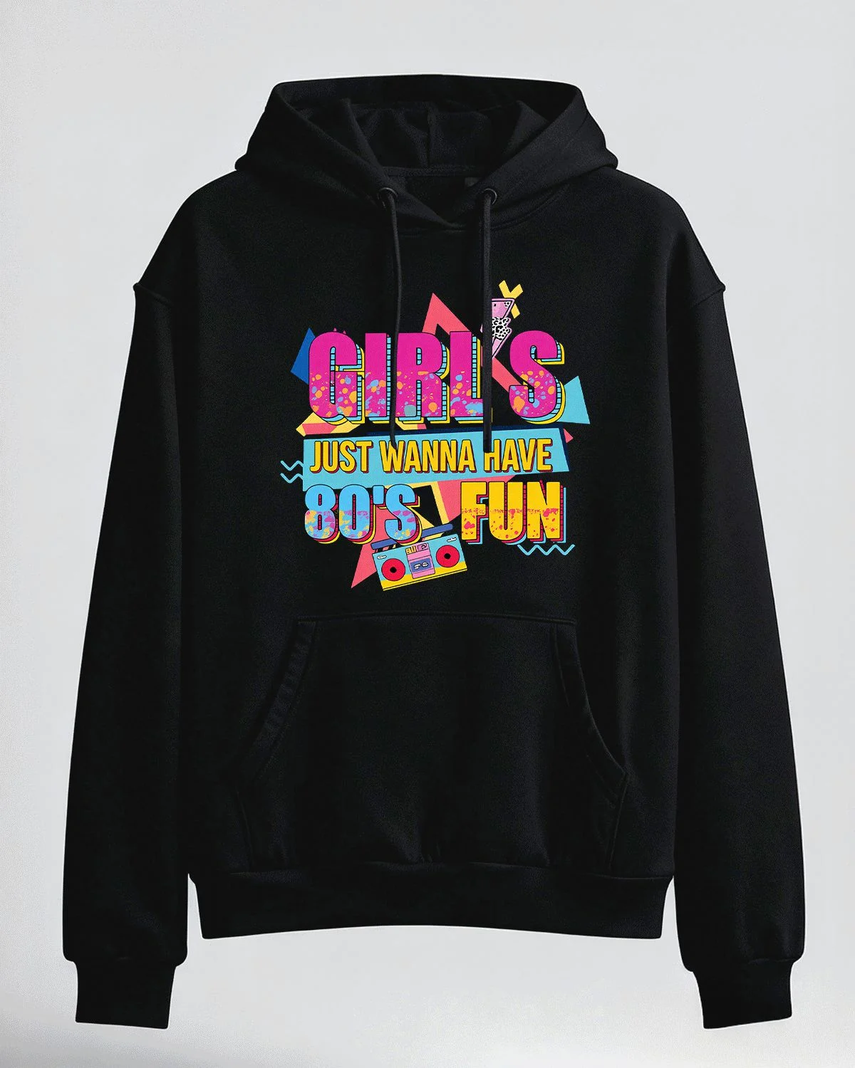Girls Just Wanna Have 80's Fun Cozy Graphic Hoodie for Men and Women - Retro Vintage, Long Sleeve, Soft Fabric, Comfortable Fit