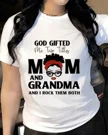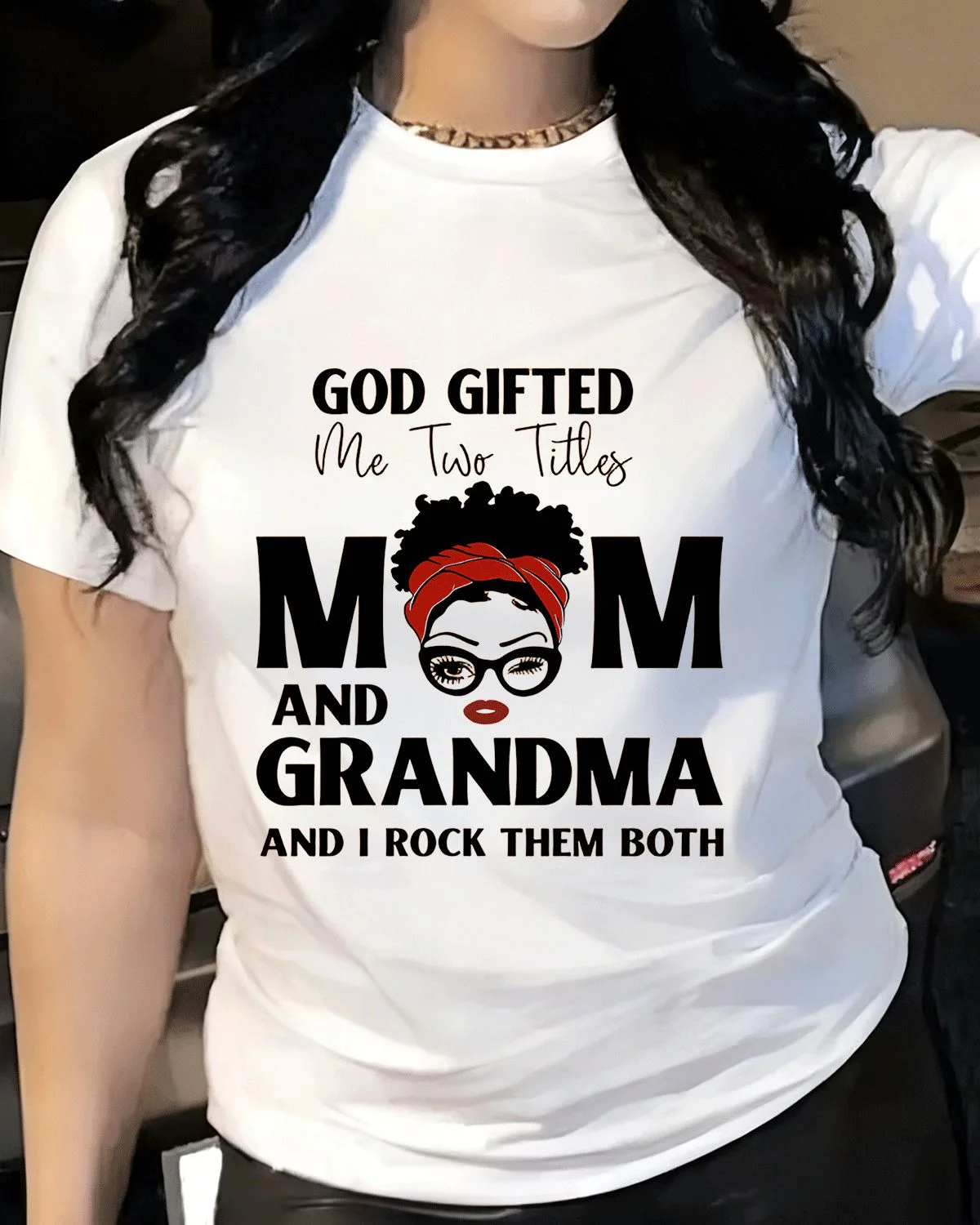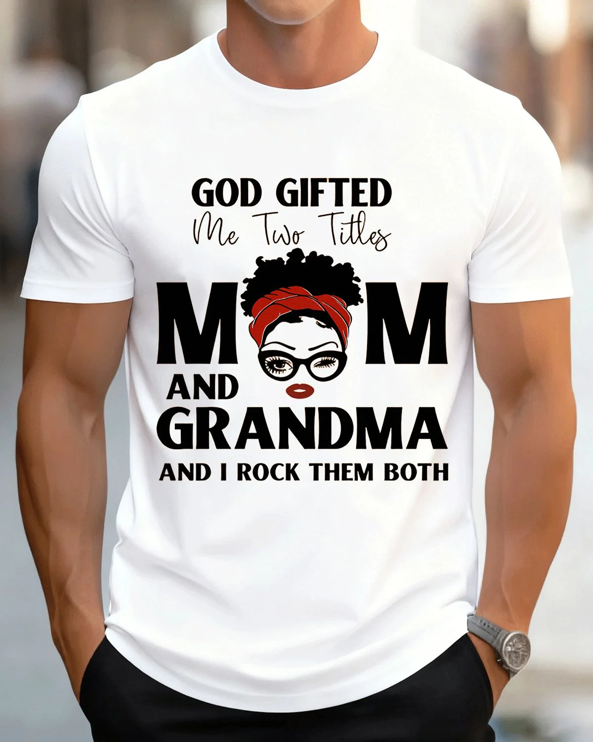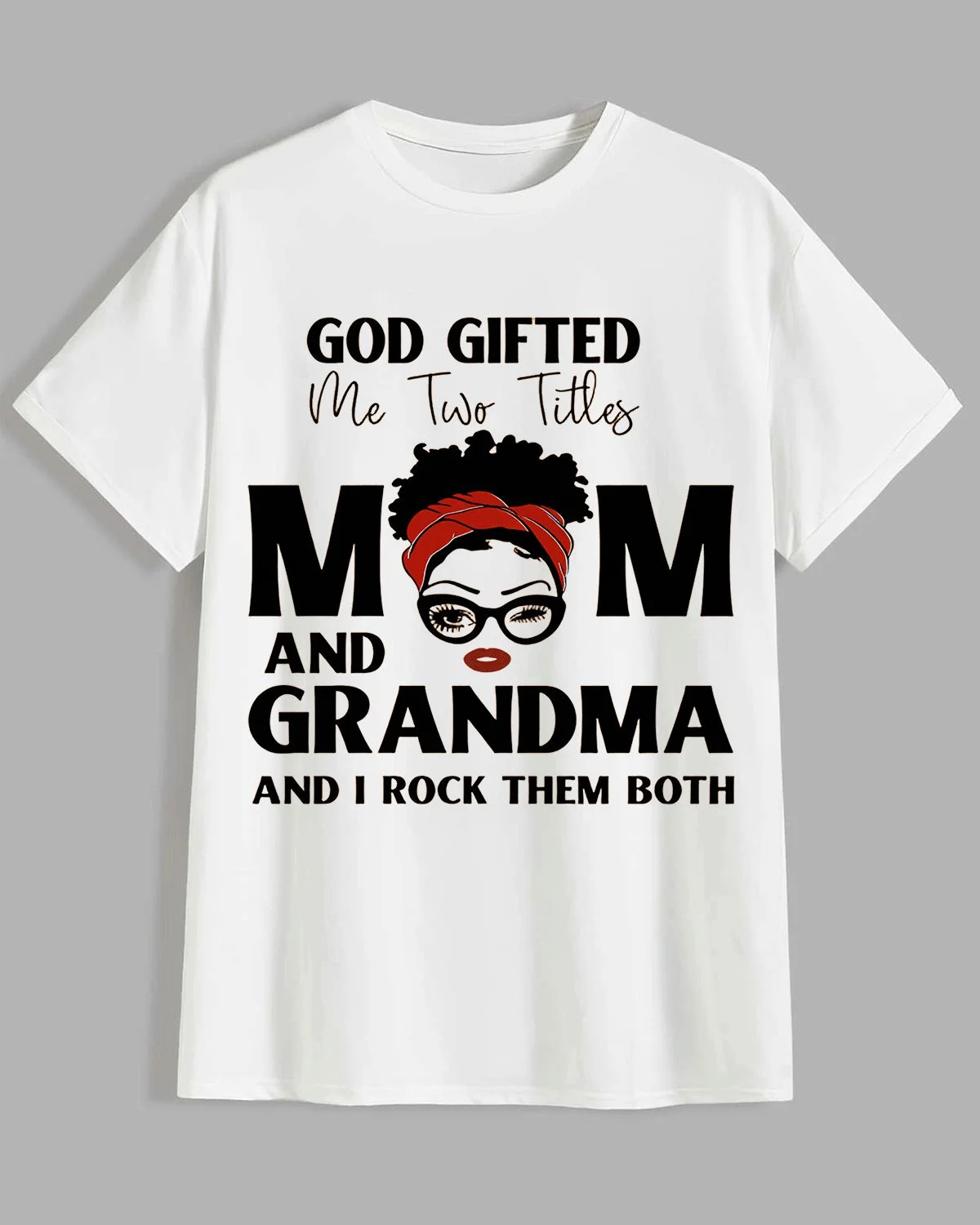 God Gifted Me Two Titles Mom and Grandma Summer Cotton Graphic T Shirt - Casual Vintage, Short Sleeve, Soft Fabric, Comfortable Fit