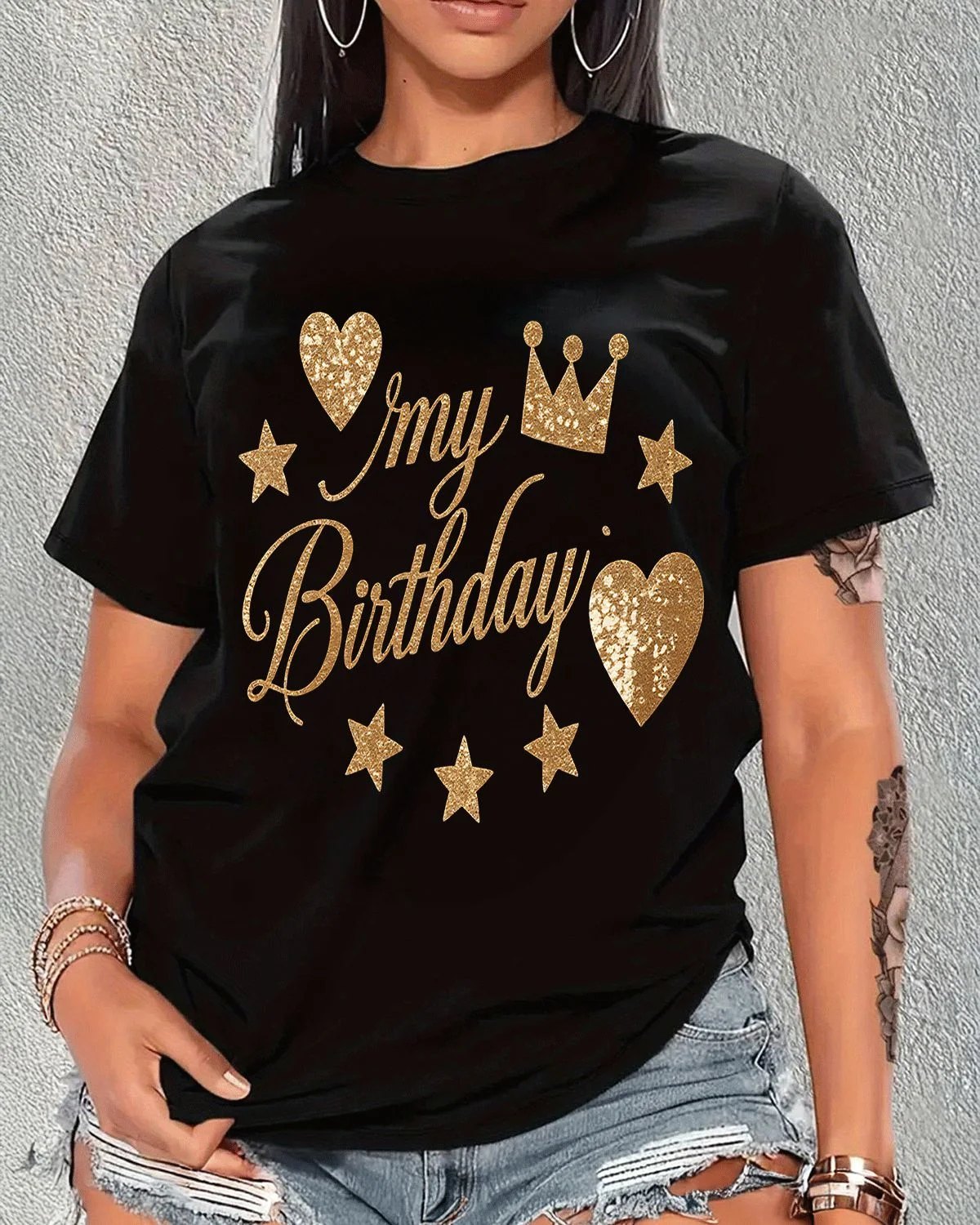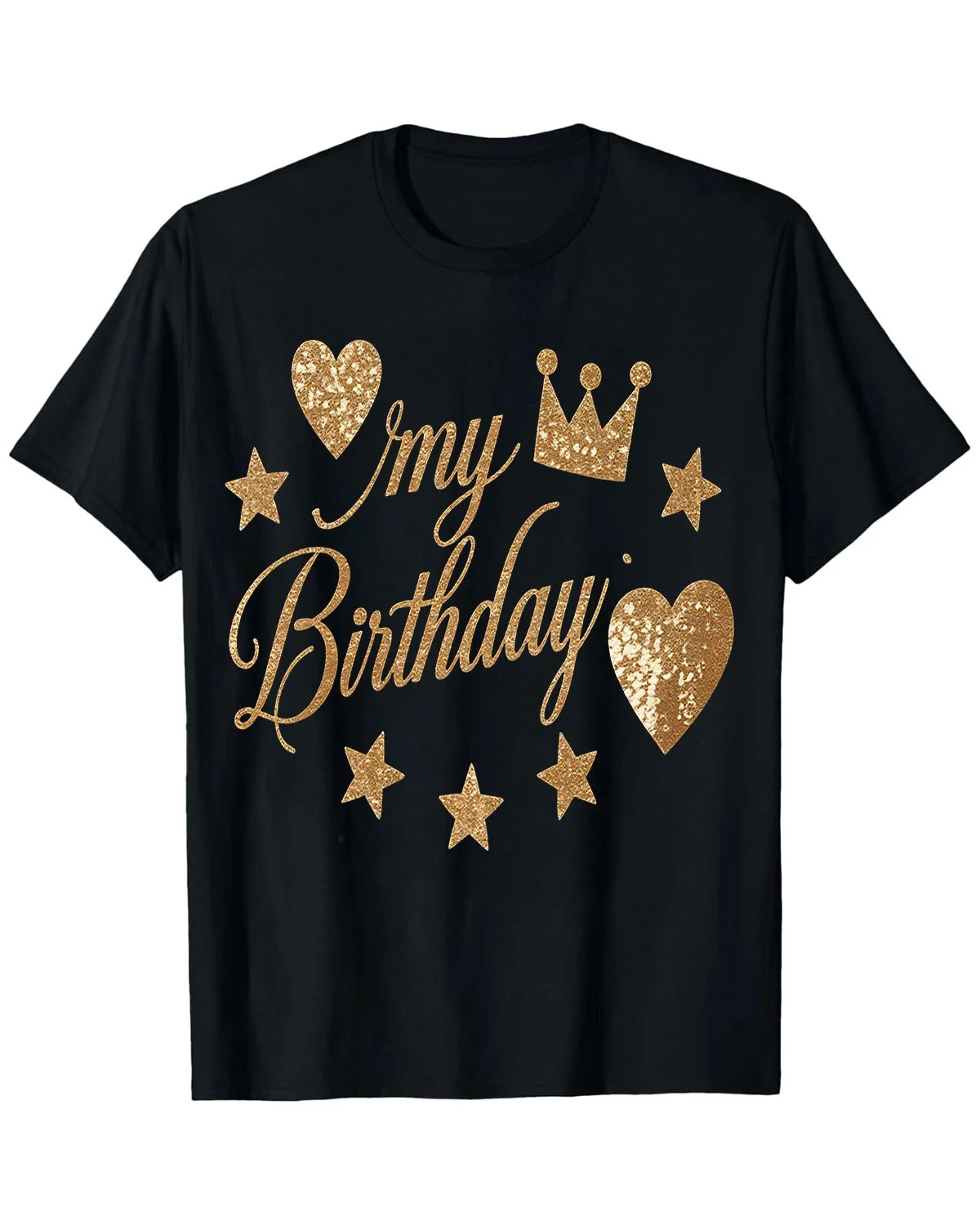 Gold Glitter My Birthday Hearts and Stars Summer Cotton Graphic T Shirt - Casual Chic, Short Sleeve, Soft Fabric, Comfortable Fit