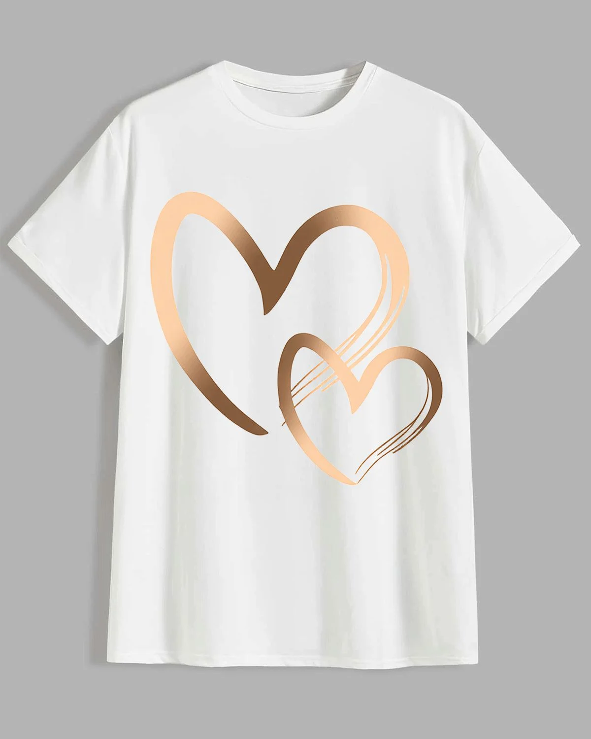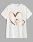 Golden Double Heart Outline Summer Cotton Graphic T Shirt - Casual Chic, Short Sleeve, Soft Fabric, Comfortable Fit