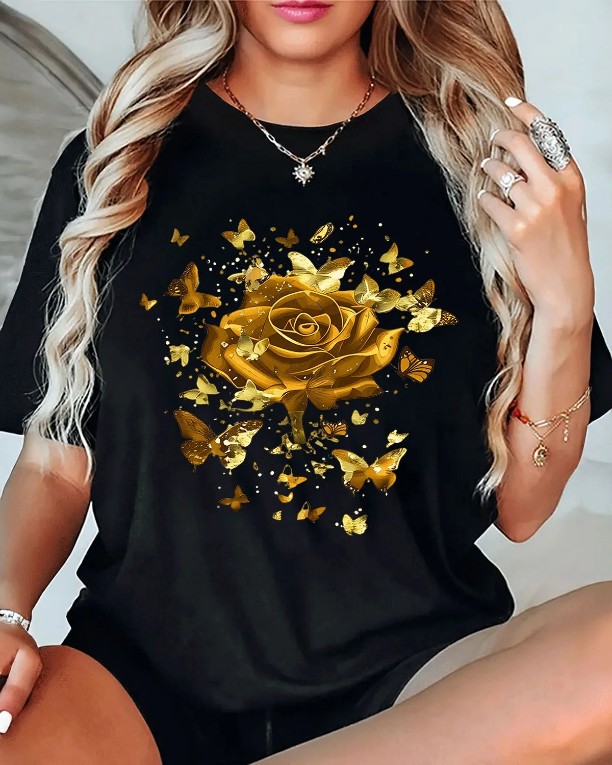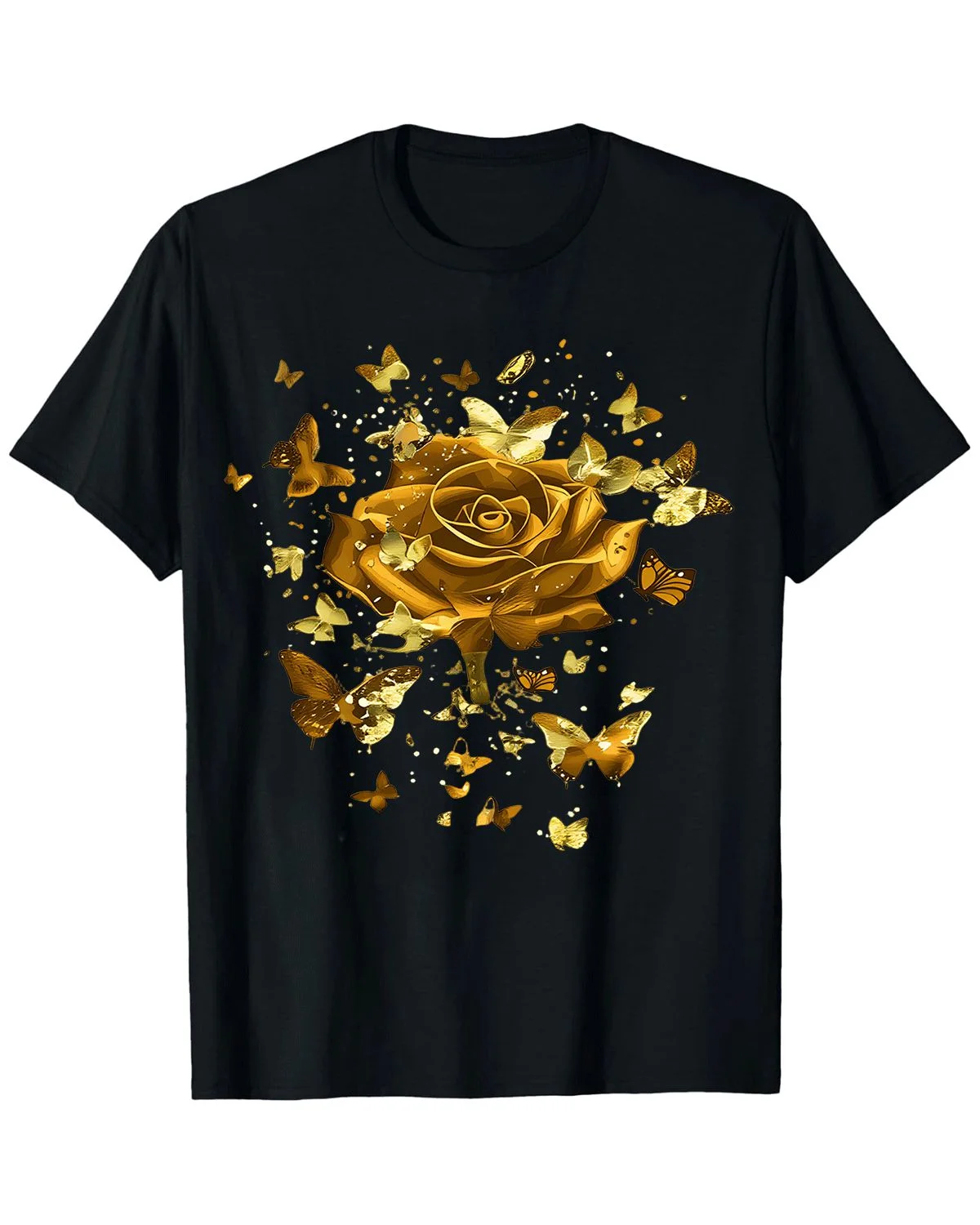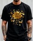 Golden Rose and Butterflies Summer Cotton Graphic T Shirt - Vintage Artistic, Short Sleeve, Soft Fabric, Comfortable Fit