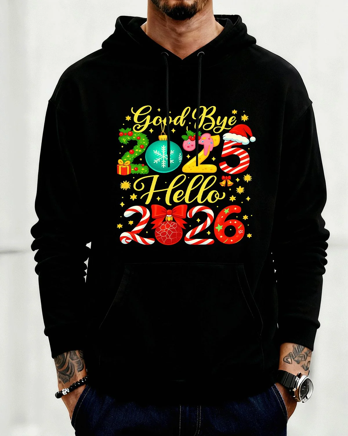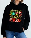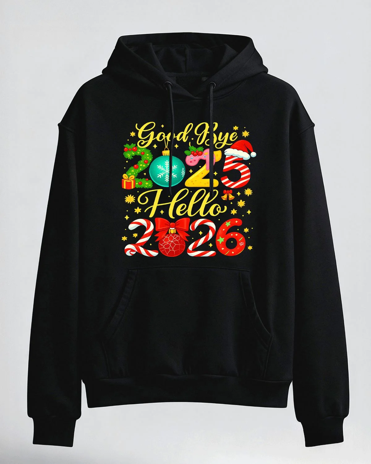 Goodbye 2025 Hello 2026 New Year Candy Holiday Cozy Graphic Hoodie for Men and Women - Casual Vintage, Long Sleeve, Soft Fabric, Comfortable Fit