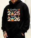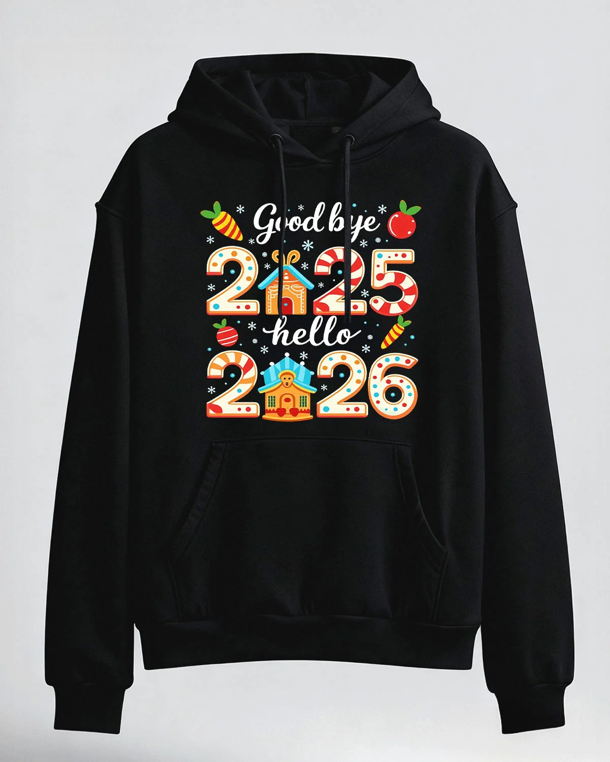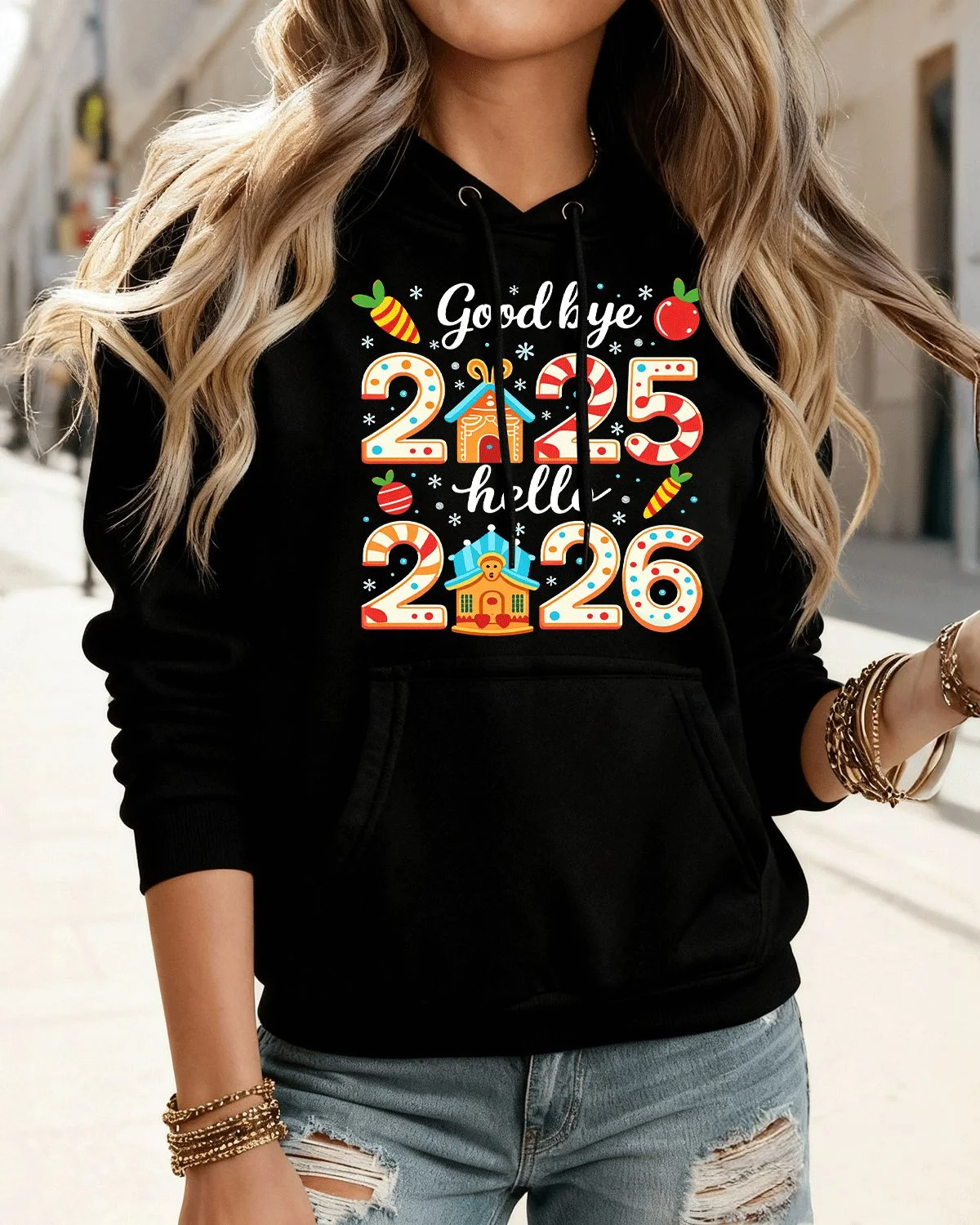 Goodbye 2025 Hello 2026 New Year Candy House Cozy Graphic Hoodie for Men and Women - Casual Retro, Long Sleeve, Soft Fabric, Comfortable Fit