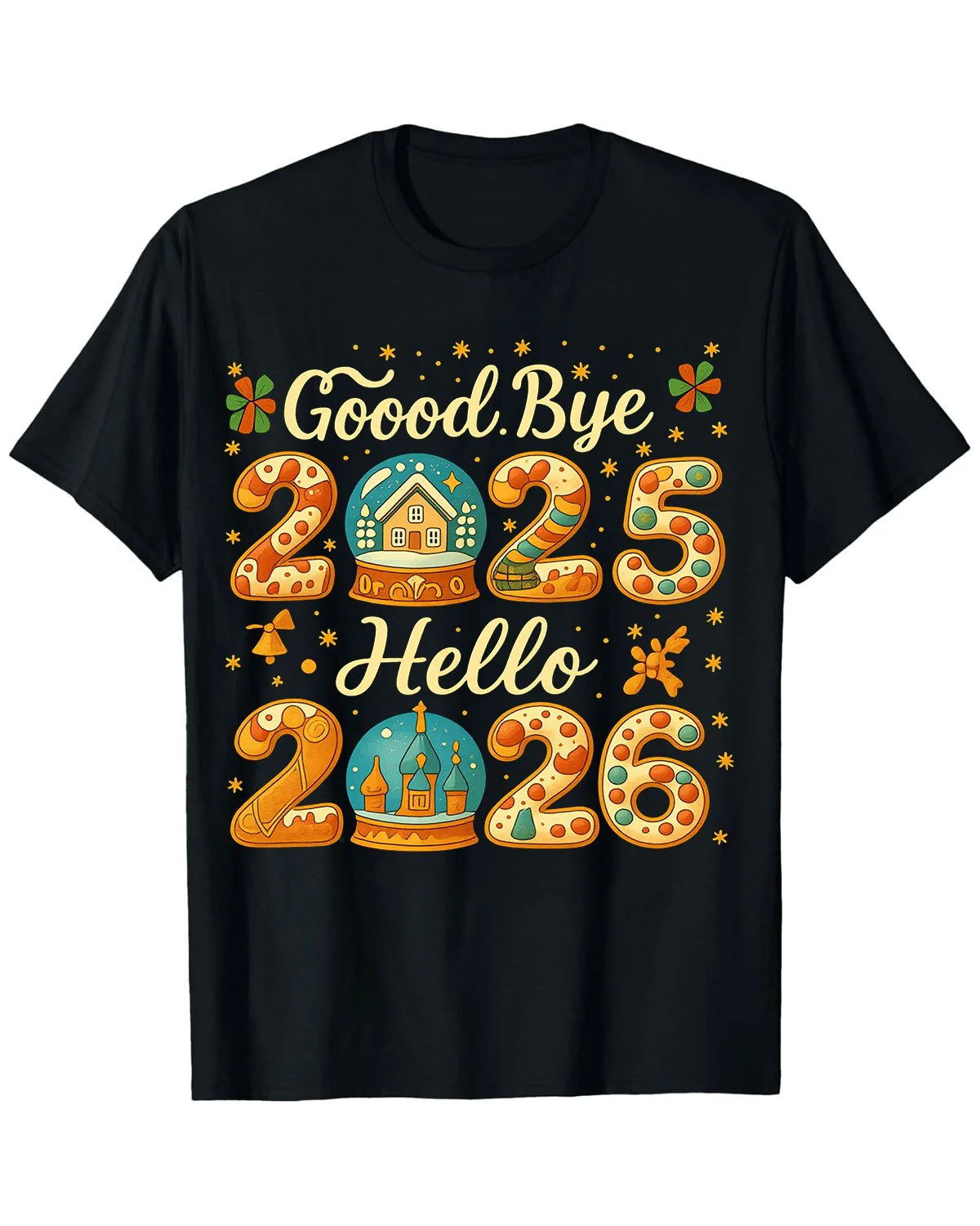 Goodbye 2025 Hello 2026 New Year Gingerbread Snow Globe Summer Cotton Graphic T Shirt - Casual Vintage, Short Sleeve, Soft Fabric, Comfortable Fit