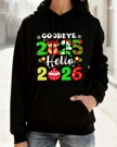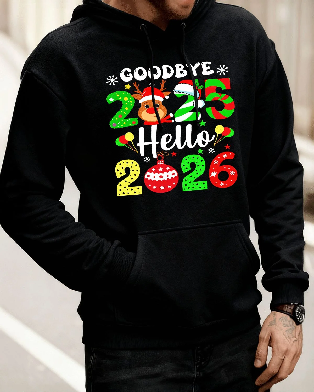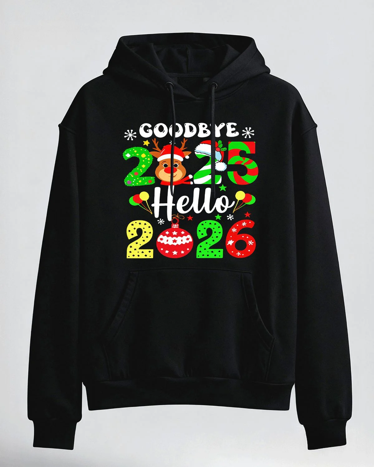 Goodbye 2025 Hello 2026 New Year Reindeer and Balloons Cozy Graphic Hoodie for Men and Women - Casual Festive, Long Sleeve, Soft Fabric, Comfortable Fit