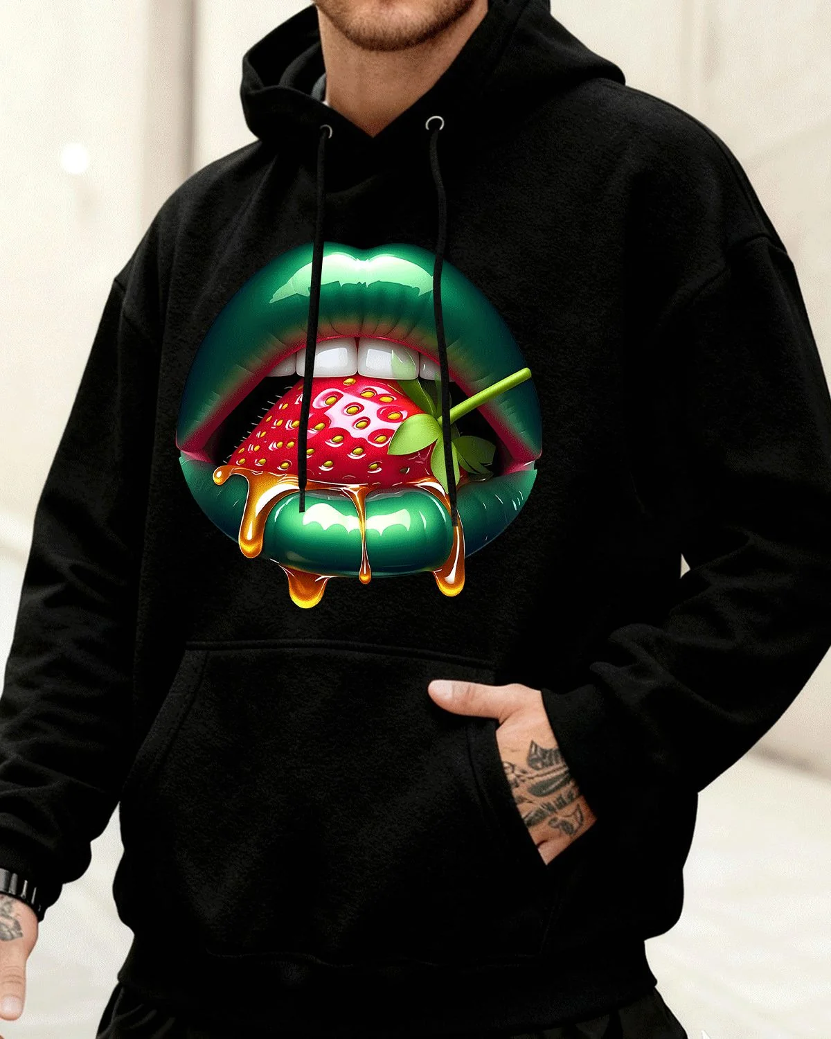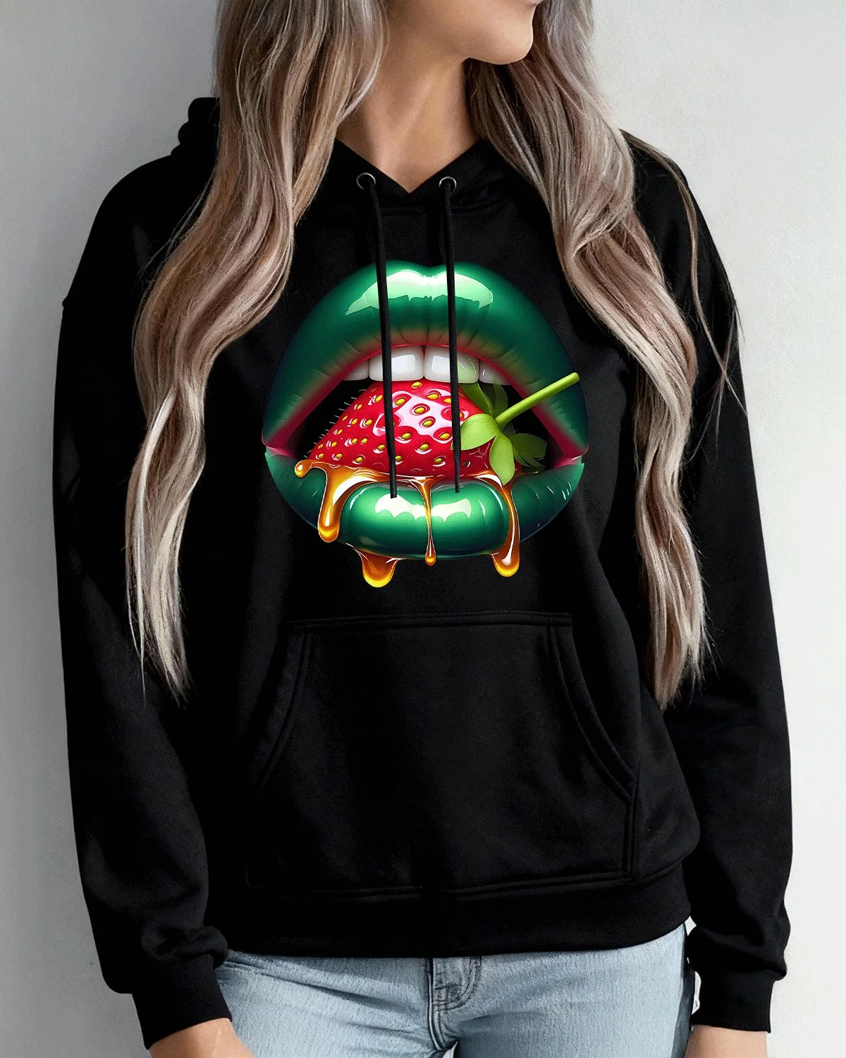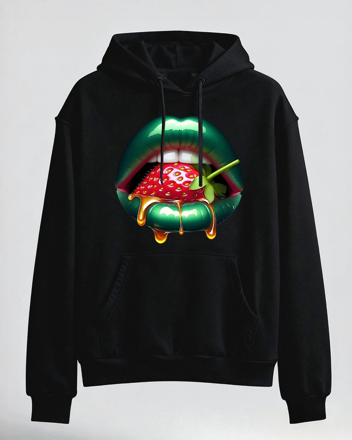 Green Lips with Strawberry and Honey Summer Cozy Graphic Hoodie-Artistic Retro,Long Sleeve,Soft Fabric,Comfortable Fit