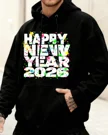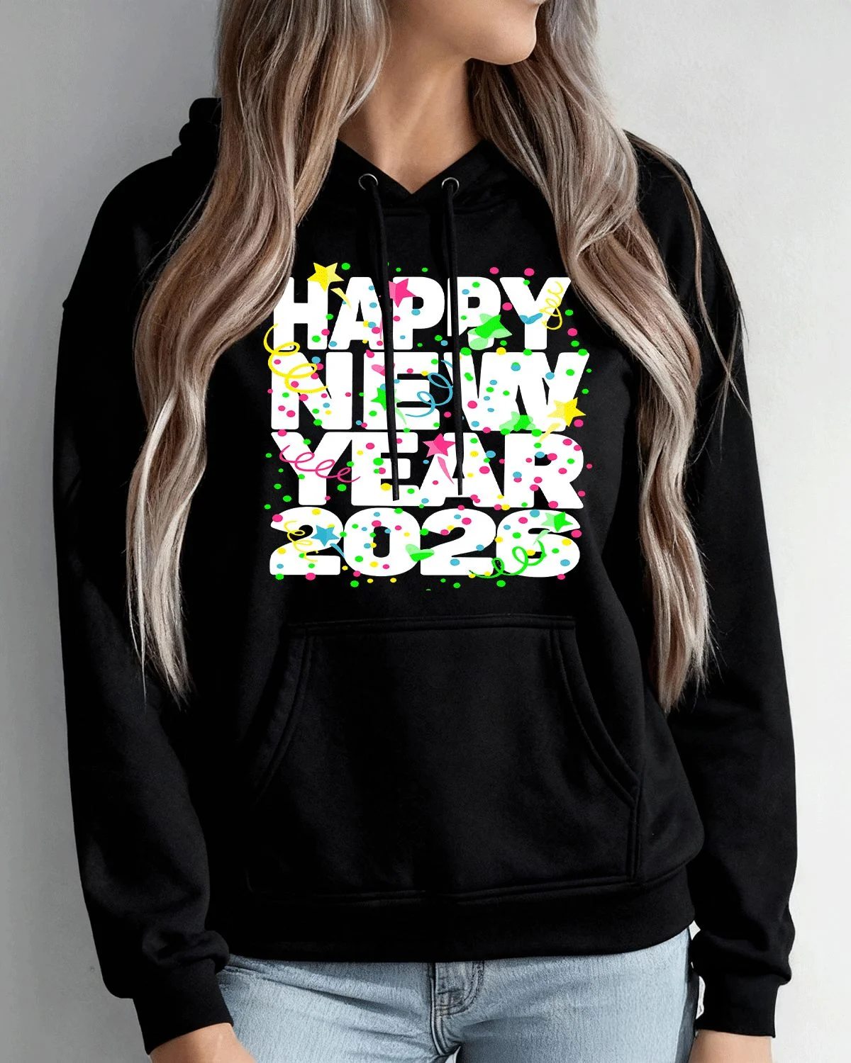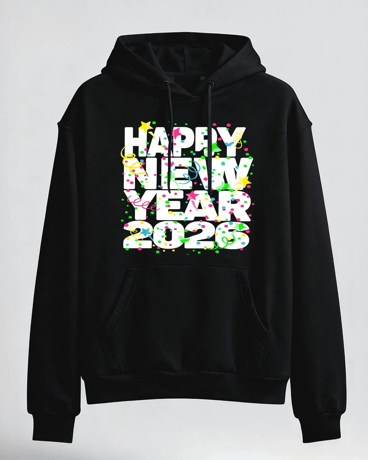 Happy 2026 New Year Confetti and Stars Cozy Graphic Hoodie for Men and Women - Casual Graphic, Long Sleeve, Soft Fabric, Comfortable Fit