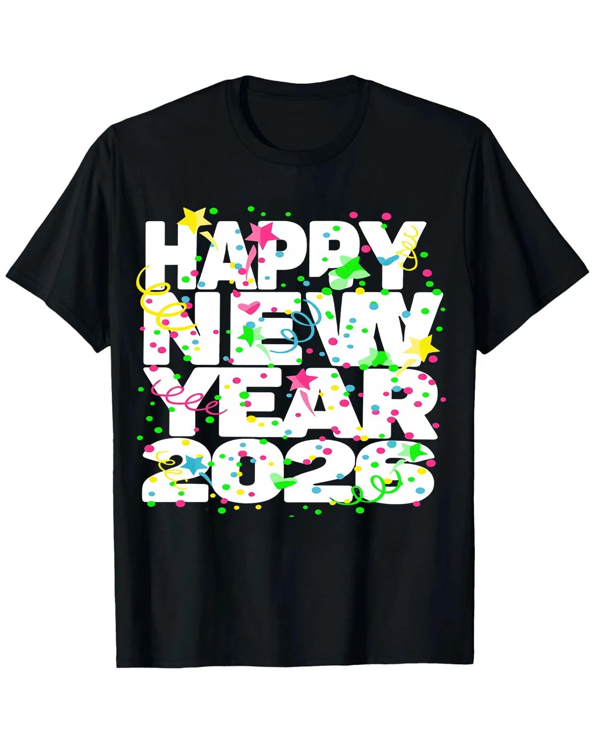 Happy 2026 New Year Confetti and Stars Summer Cotton Graphic T Shirt - Casual Graphic, Short Sleeve, Soft Fabric, Comfortable Fit