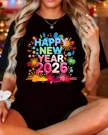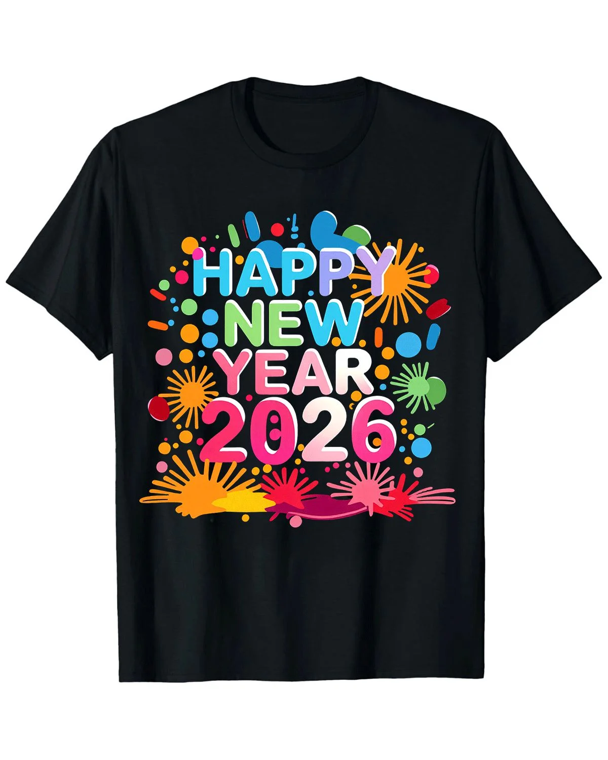 Happy 2026 New Year Fireworks Burst Summer Cotton Graphic T Shirt - Casual Graphic, Short Sleeve, Soft Fabric, Comfortable Fit