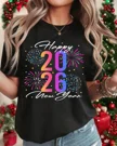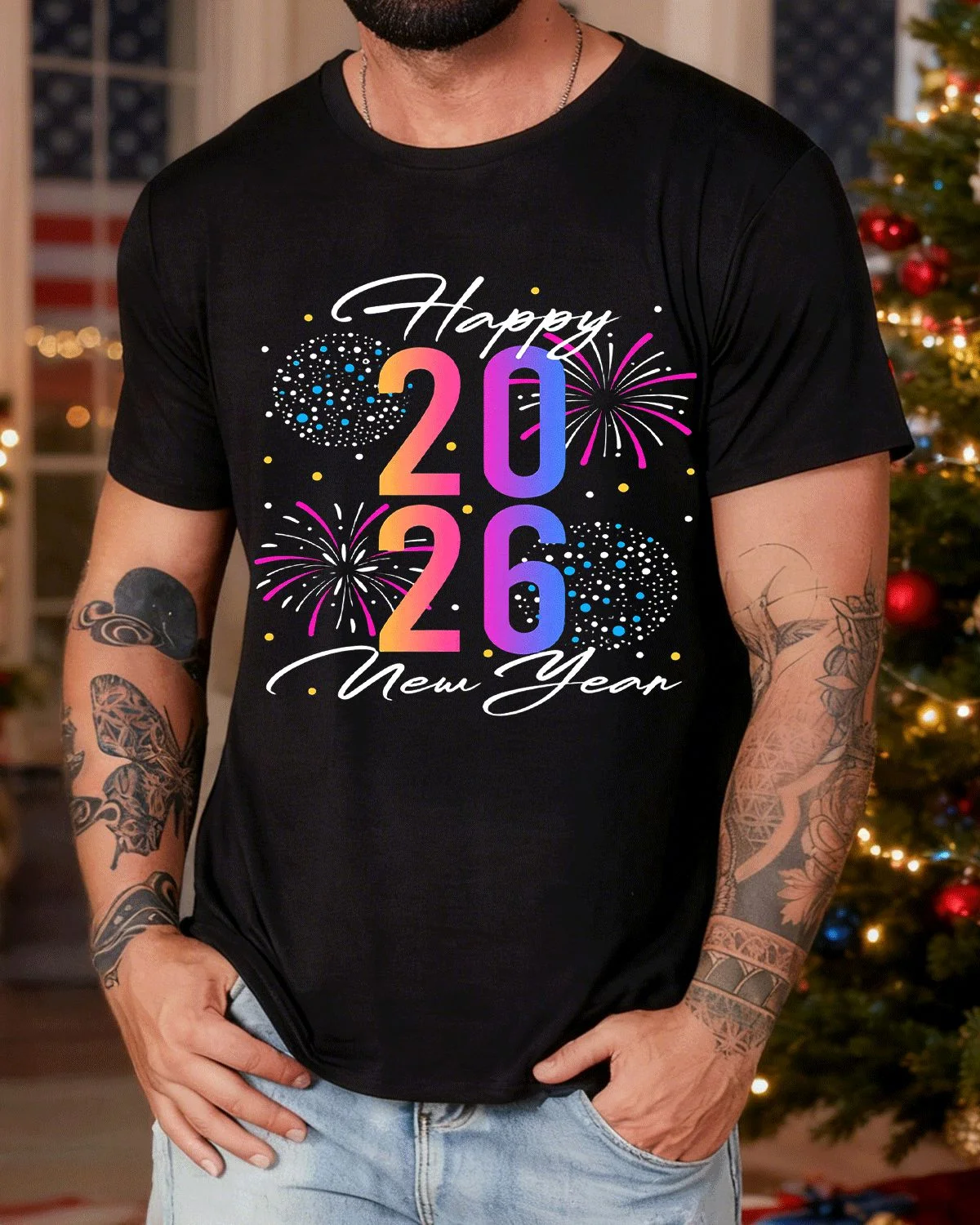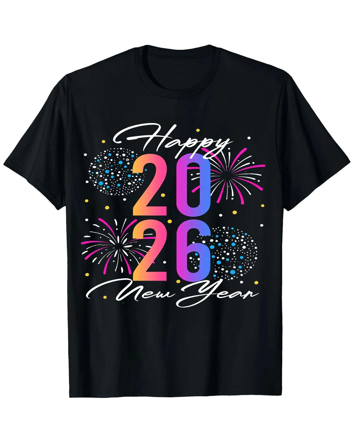 Happy 2026 New Year Fireworks Summer Cotton Graphic T Shirt - Casual Vintage, Short Sleeve, Soft Fabric, Comfortable Fit