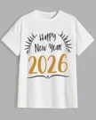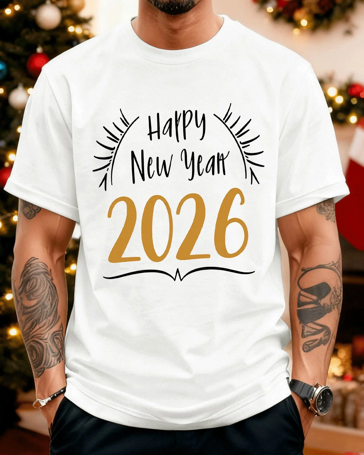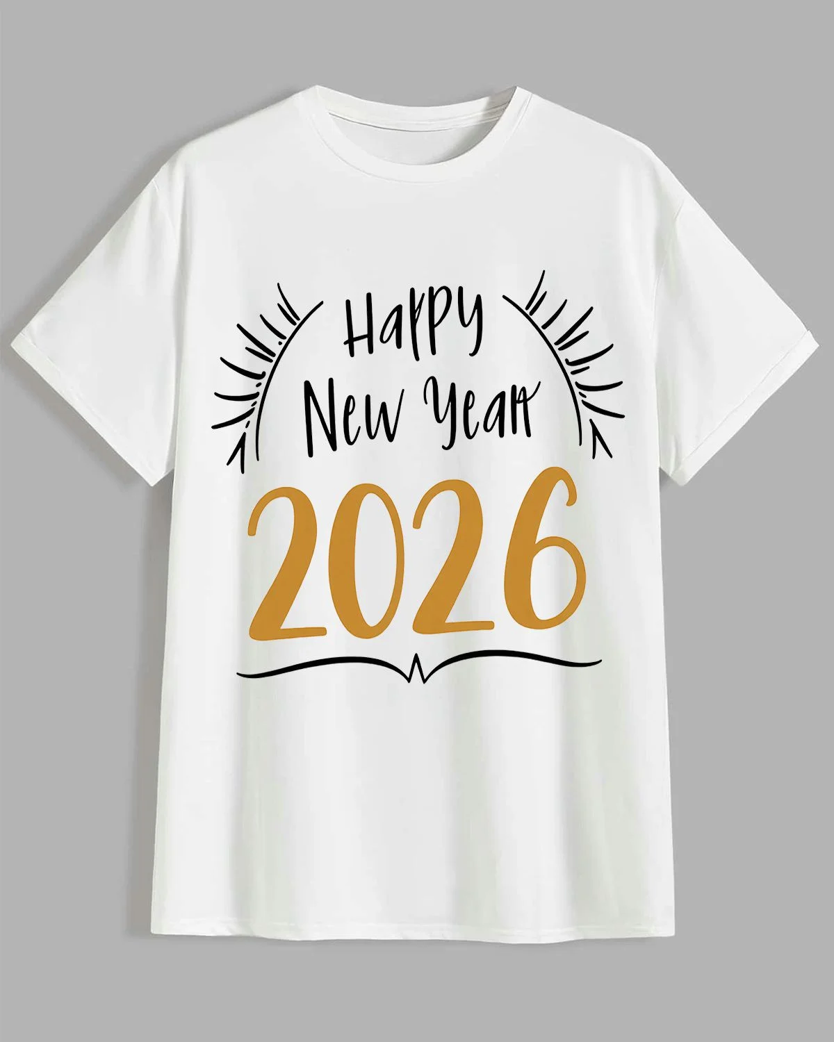 Happy 2026 New Year Gold Text Summer Cotton Graphic T Shirt - Casual Vintage, Short Sleeve, Soft Fabric, Comfortable Fit