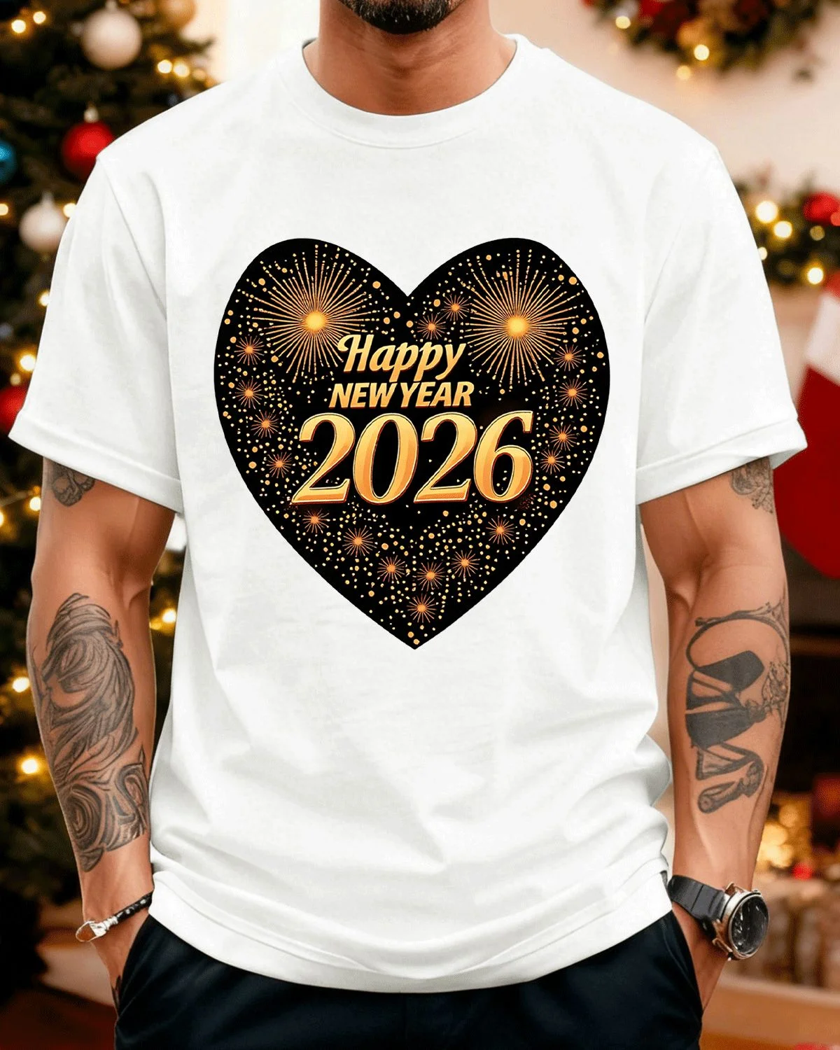 Happy 2026 New Year Heart Fireworks Summer Cotton Graphic T Shirt - Casual Vintage, Short Sleeve, Soft Fabric, Comfortable Fit