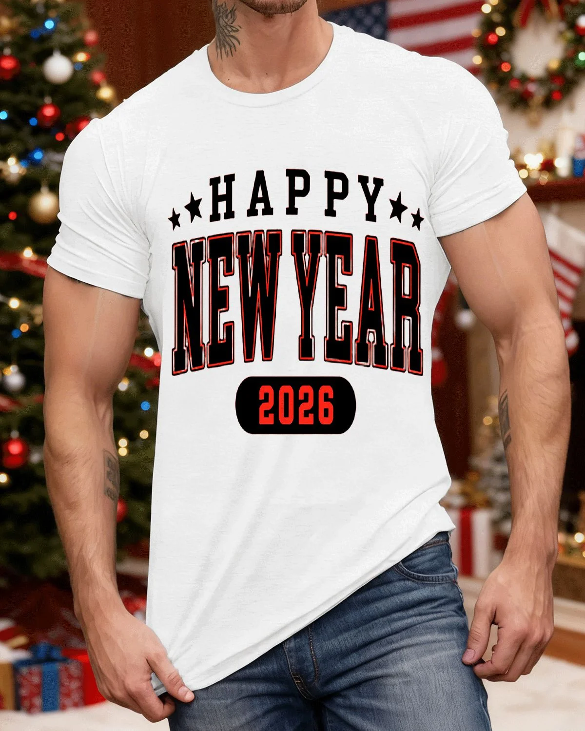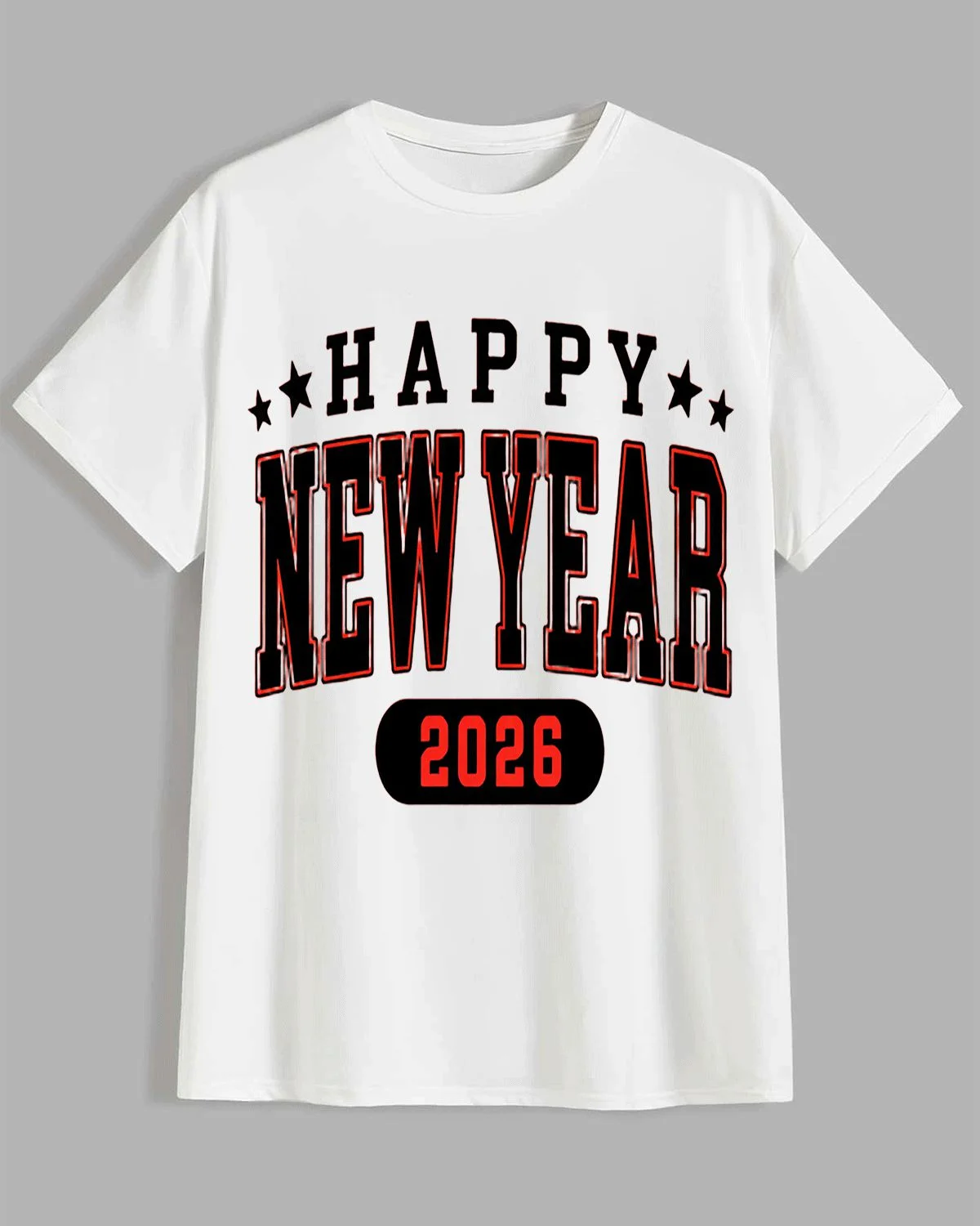 Happy 2026 New Year Stars Summer Cotton Graphic T Shirt - Casual Vintage, Short Sleeve, Soft Fabric, Comfortable Fit
