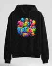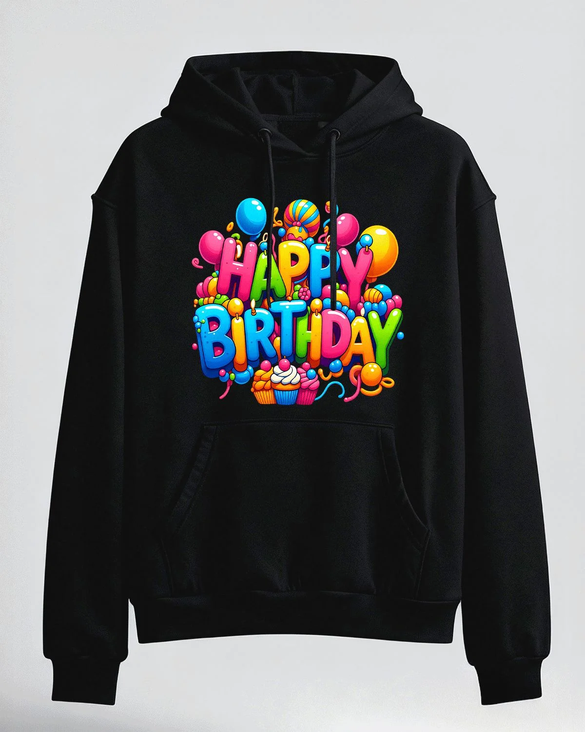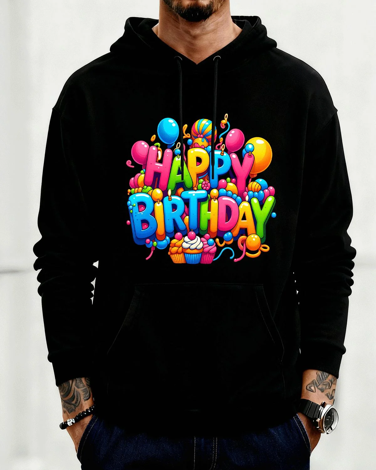 Happy Birthday Balloons and Cupcakes Cozy Graphic Hoodie for Men and Women - Casual Funny, Long Sleeve, Soft Fabric, Comfortable Fit