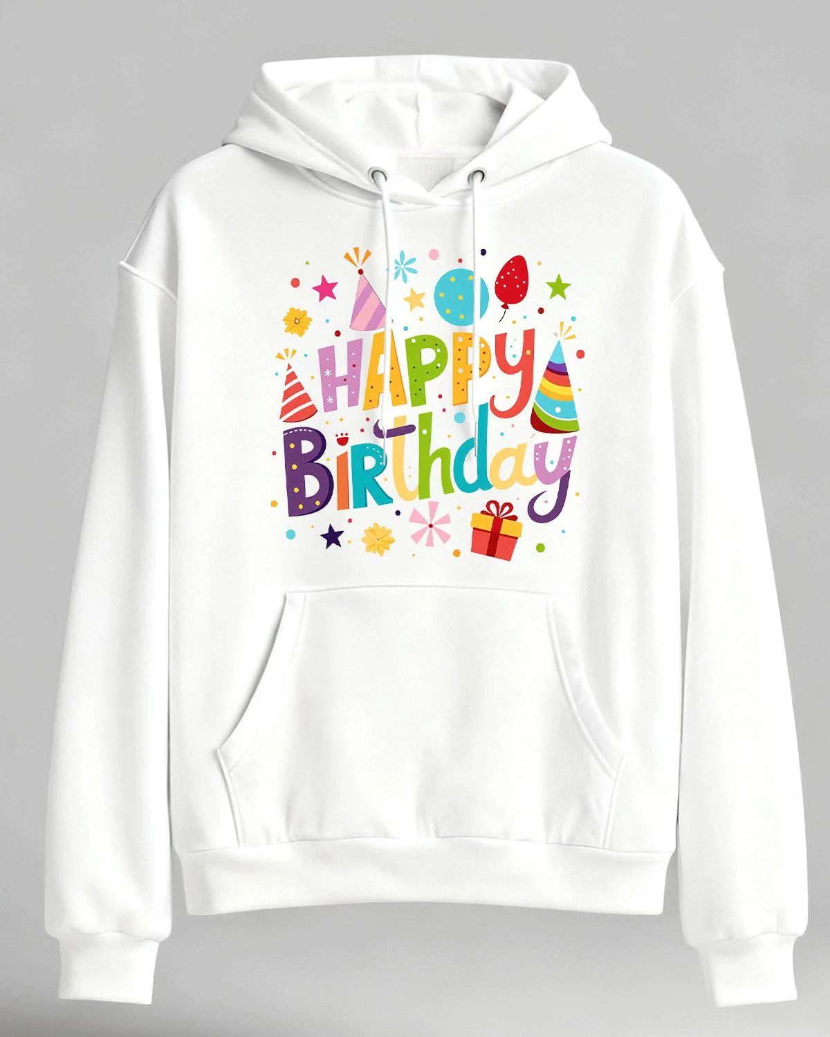 Happy Birthday Colorful Letters and Party Icons Cozy Graphic Hoodie for Men and Women - Casual Graphic, Long Sleeve, Soft Fabric, Comfortable Fit