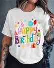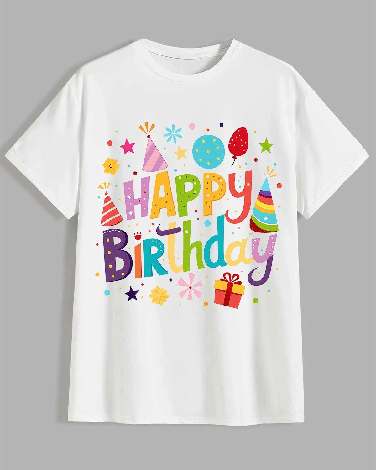 Happy Birthday Colorful Letters and Party Icons Summer Cotton Graphic T Shirt - Casual Graphic, Short Sleeve, Soft Fabric, Comfortable Fit
