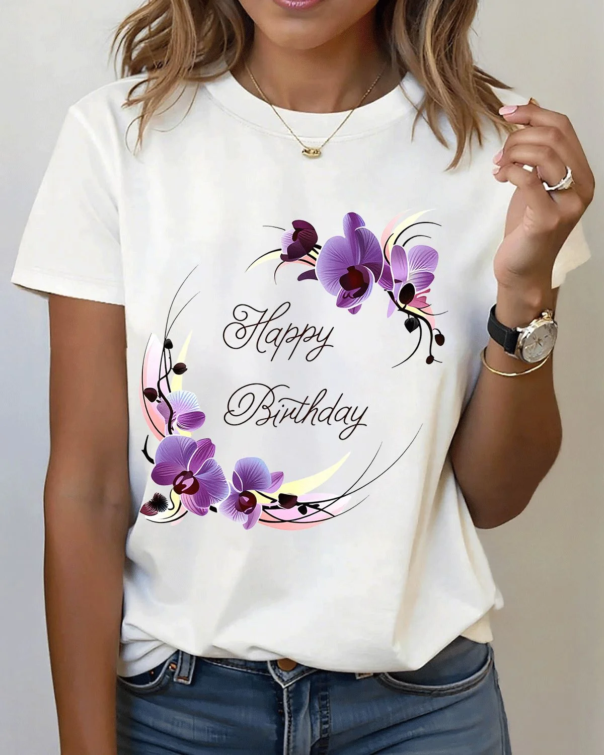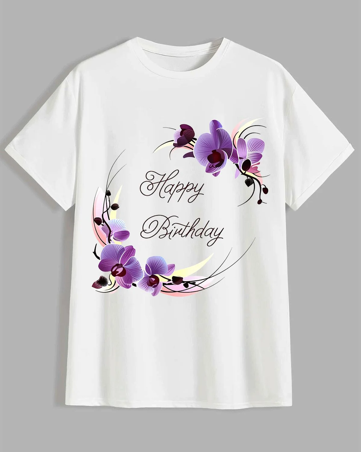 Happy Birthday Purple Orchid Floral Wreath Summer Cotton Graphic T Shirt - Artistic Vintage, Short Sleeve, Soft Fabric, Comfortable Fit