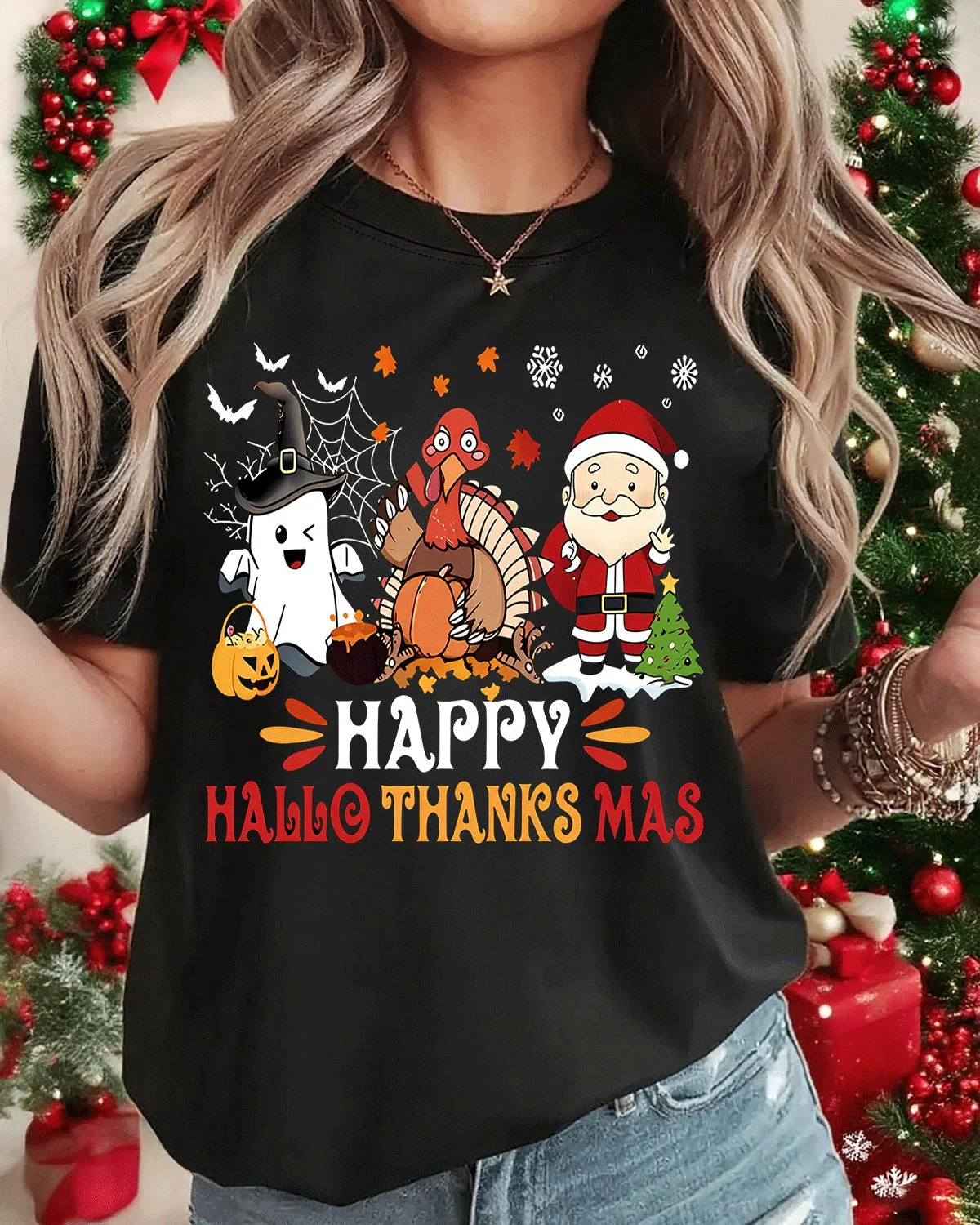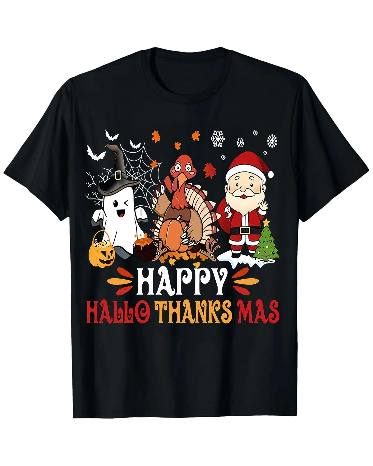 Happy HalloThanksMas Christmas Summer Cotton Graphic T Shirt - Casual Funny, Short Sleeve, Soft Fabric, Comfortable Fit