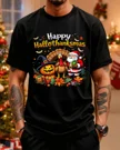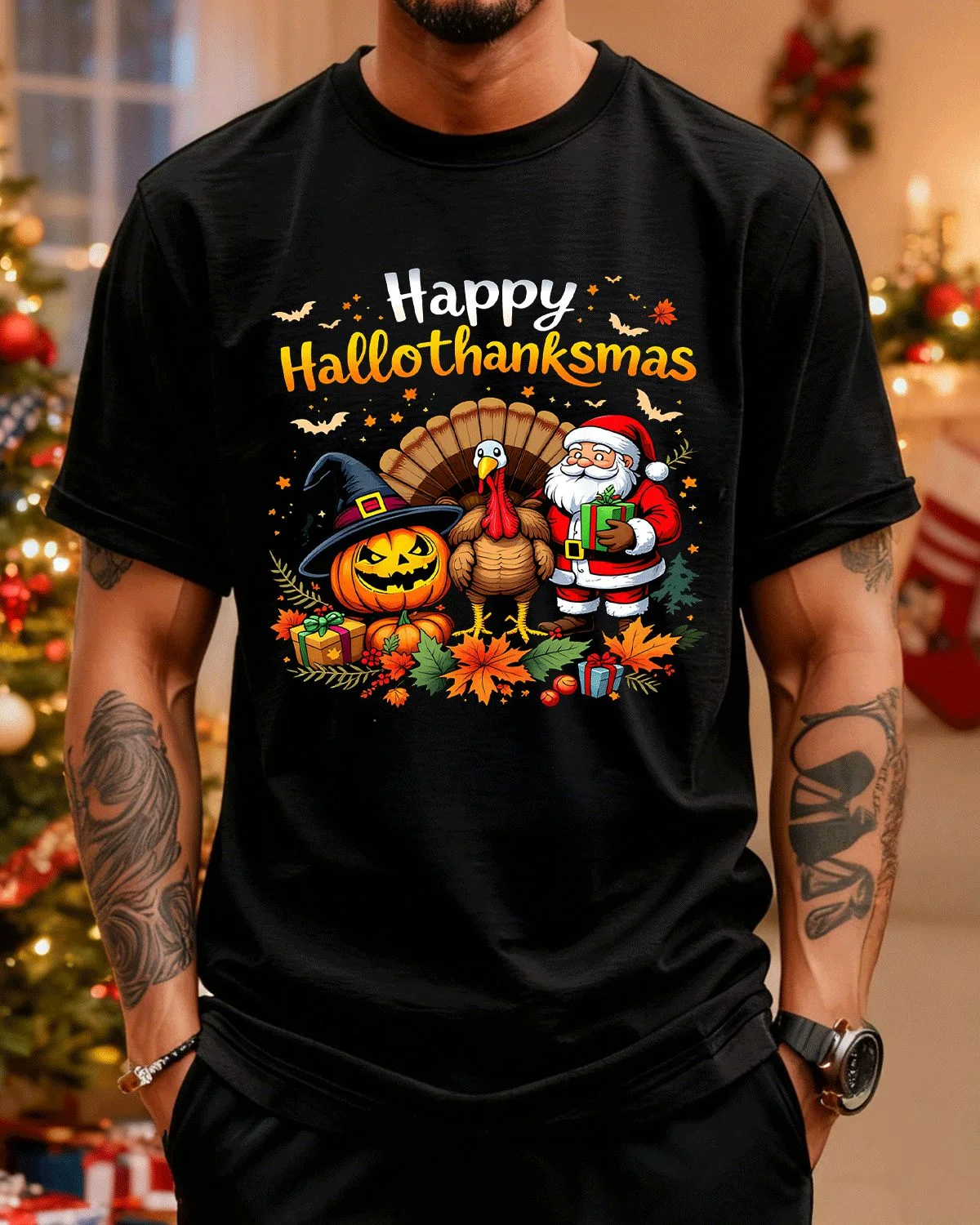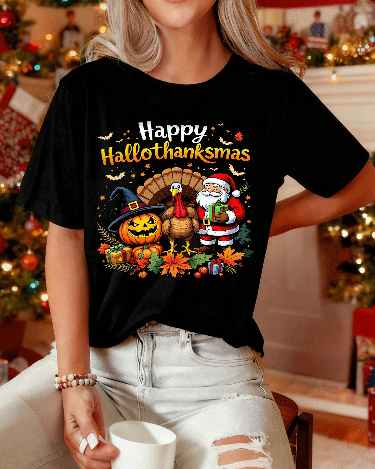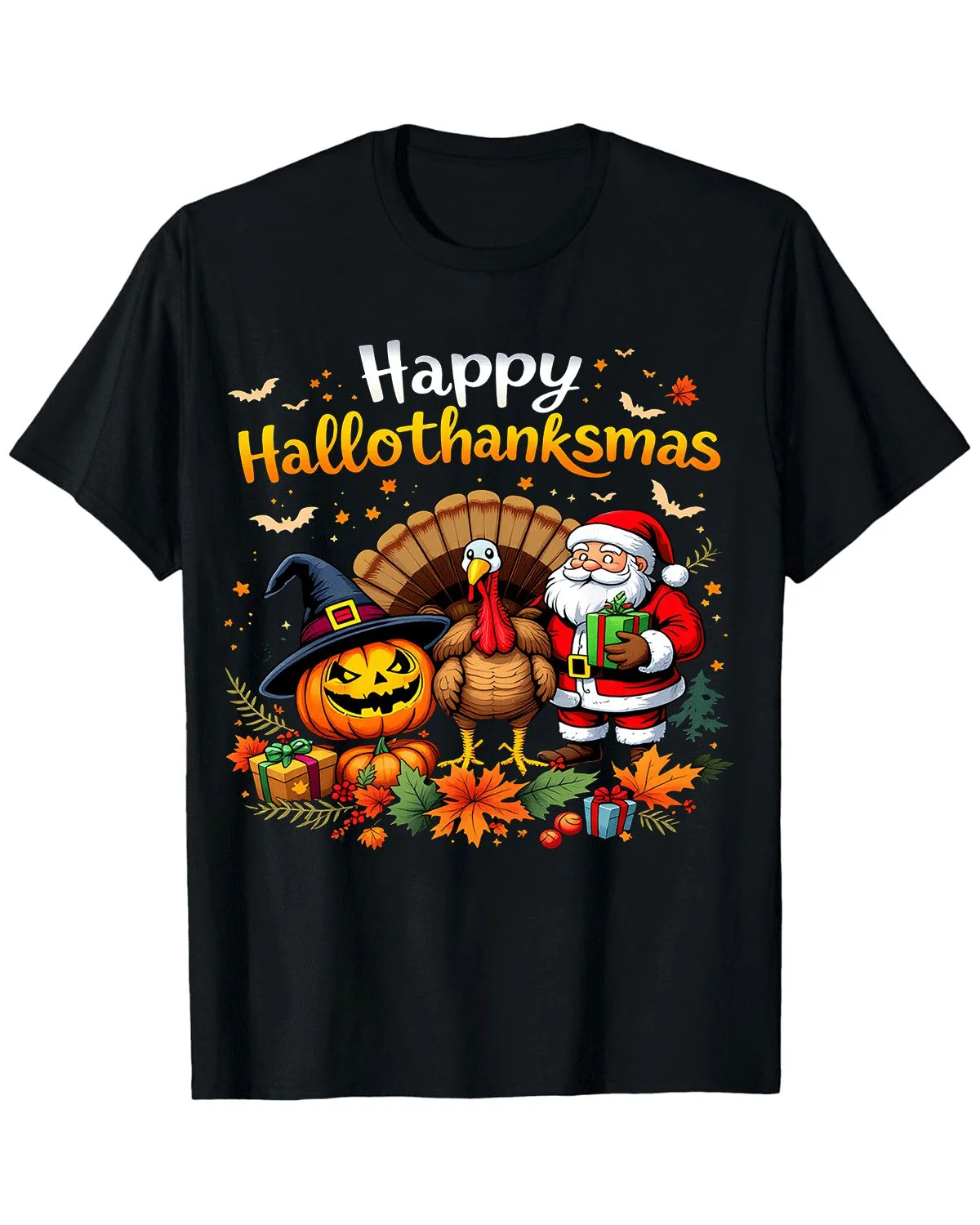 Happy Hallothanksmas Christmas Turkey Santa Pumpkin Summer Cotton Graphic T Shirt - Funny Casual, Short Sleeve, Soft Fabric, Comfortable Fit