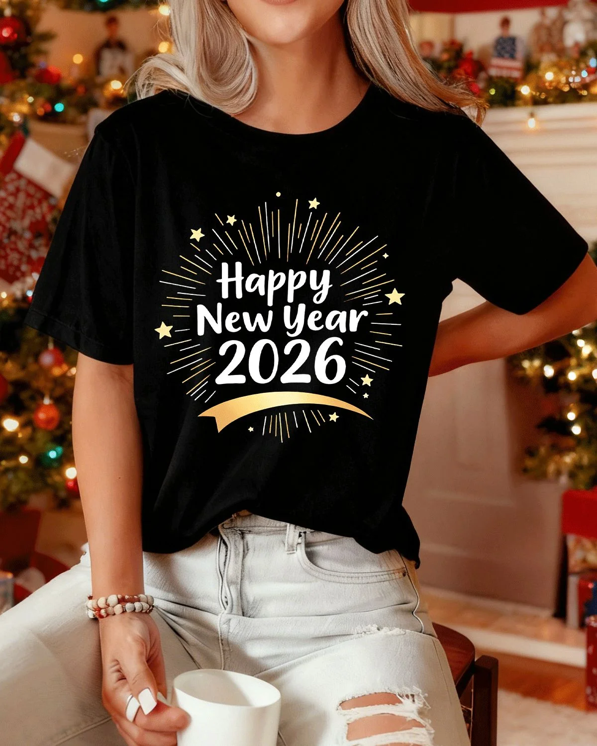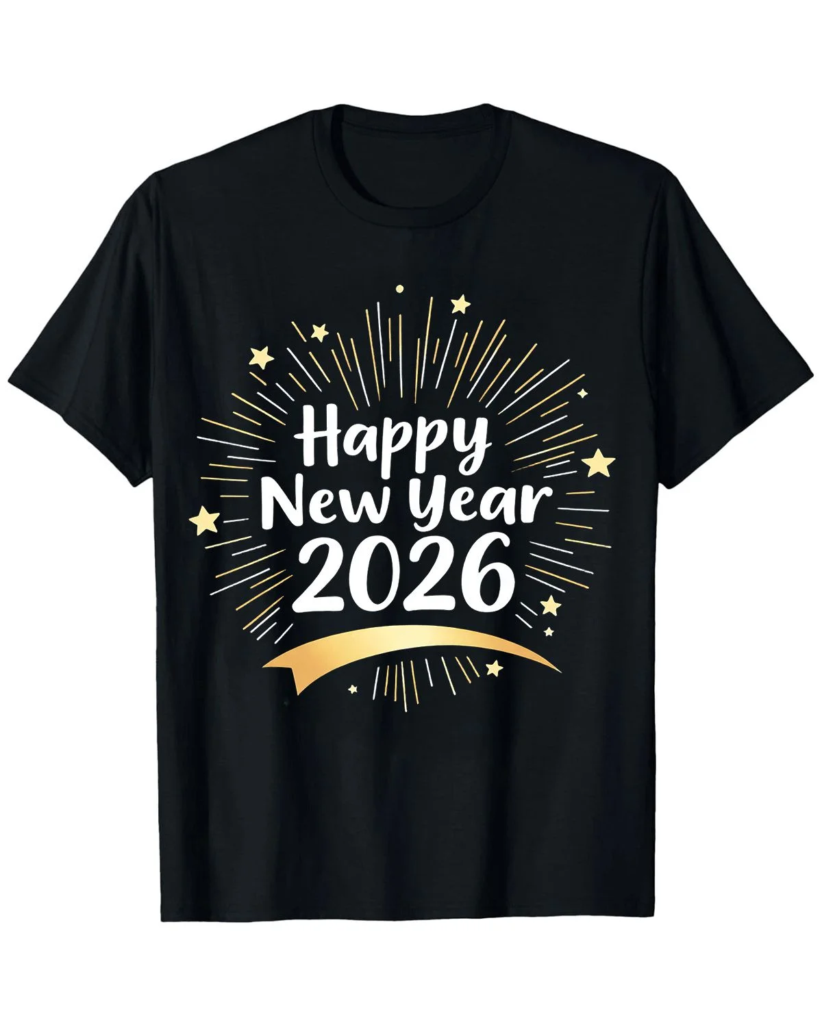 Happy New Year 2026 Fireworks Burst Summer Cotton Graphic T Shirt - Casual Trendy, Short Sleeve, Soft Fabric, Comfortable Fit