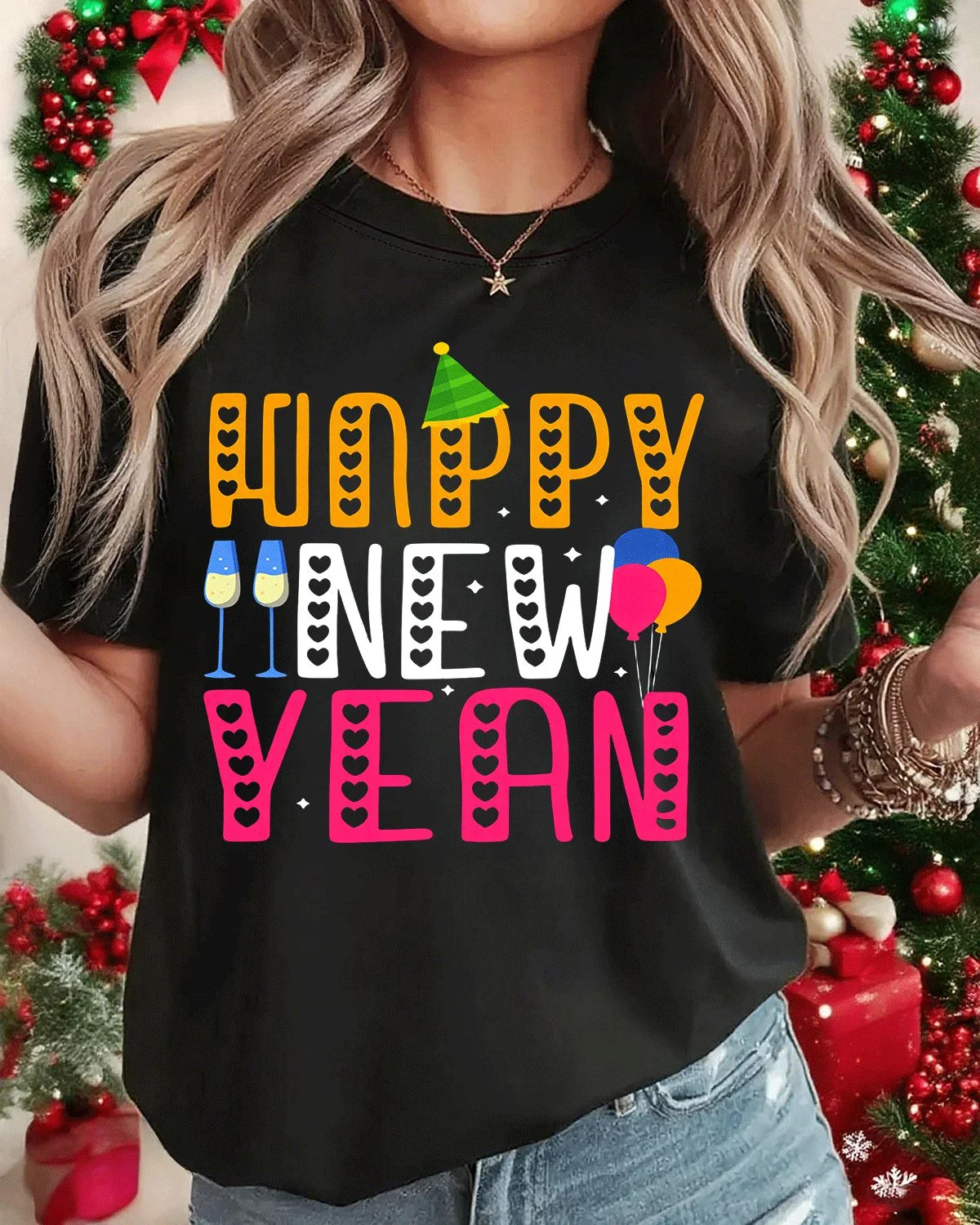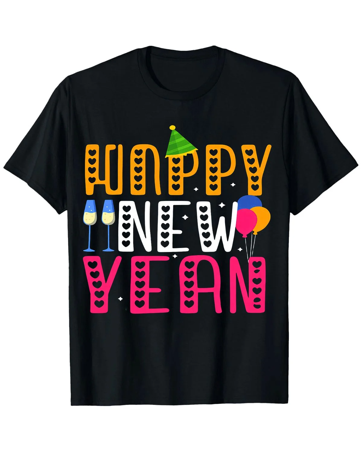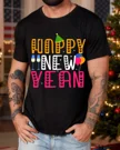Happy New Year Champagne and Balloons Summer Cotton Graphic T Shirt - Casual Graphic, Short Sleeve, Soft Fabric, Comfortable Fit