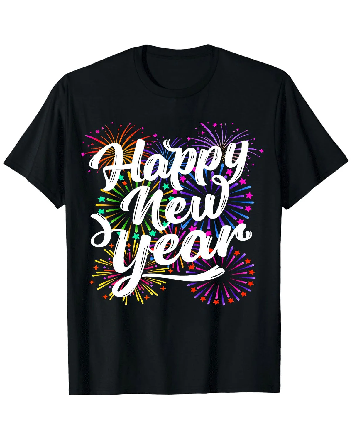 Happy New Year Colorful Fireworks Summer Cotton Graphic T Shirt - Casual Graphic, Short Sleeve, Soft Fabric, Comfortable Fit
