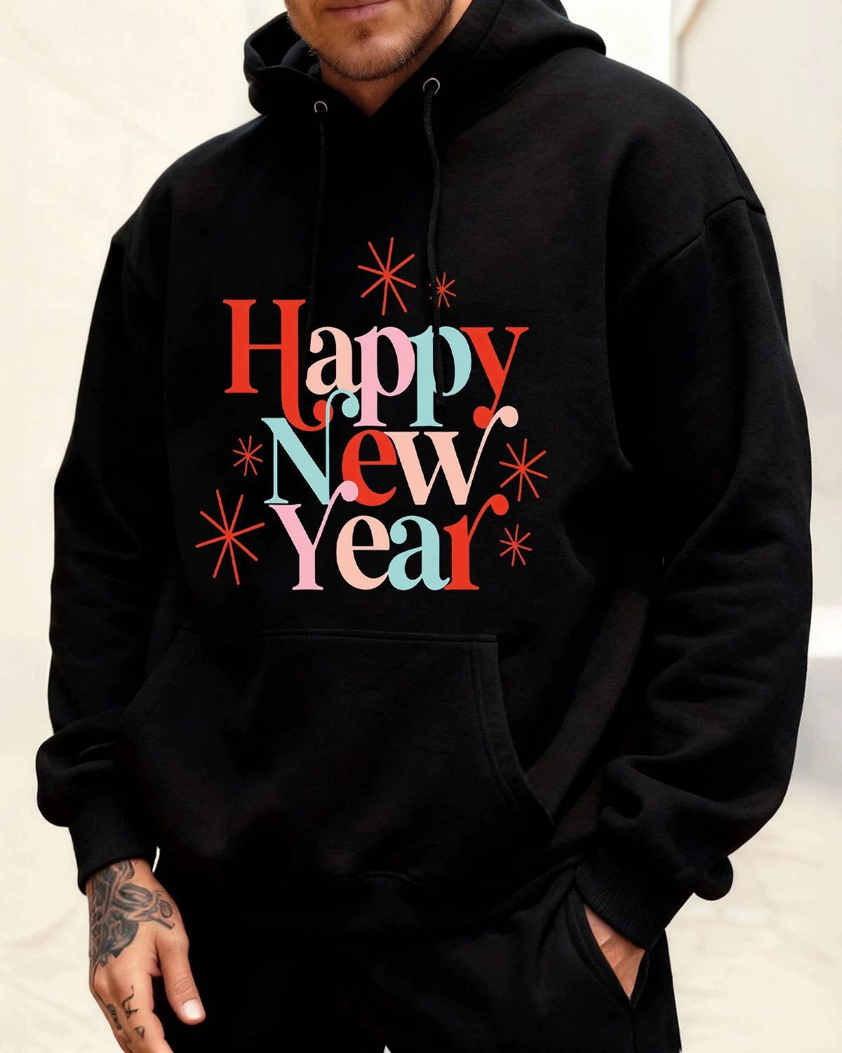 Happy New Year Colorful Lettering and Stars Cozy Graphic Hoodie for Men and Women - Casual Retro, Long Sleeve, Soft Fabric, Comfortable Fit