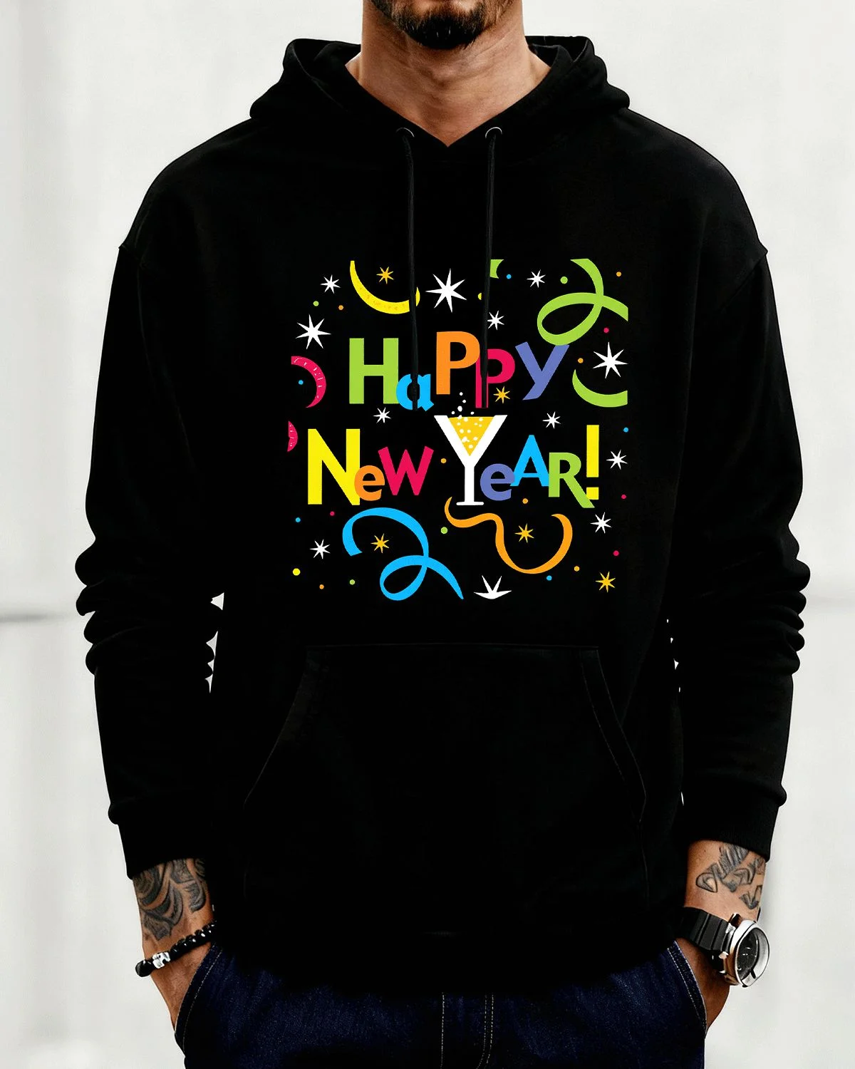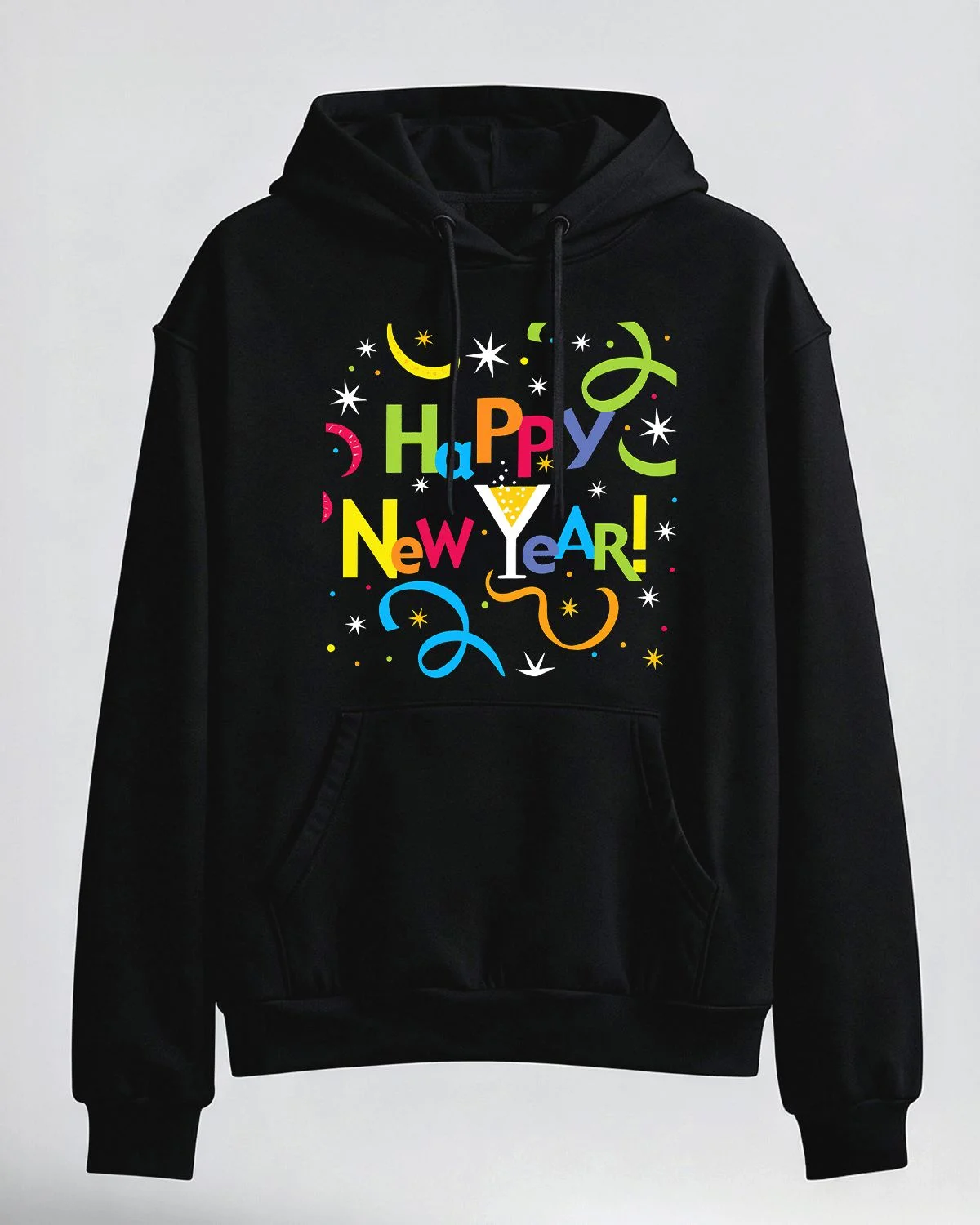 Happy New Year Colorful Letters and Confetti Cozy Graphic Hoodie for Men and Women - Graphic Trendy, Long Sleeve, Soft Fabric, Comfortable Fit