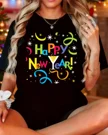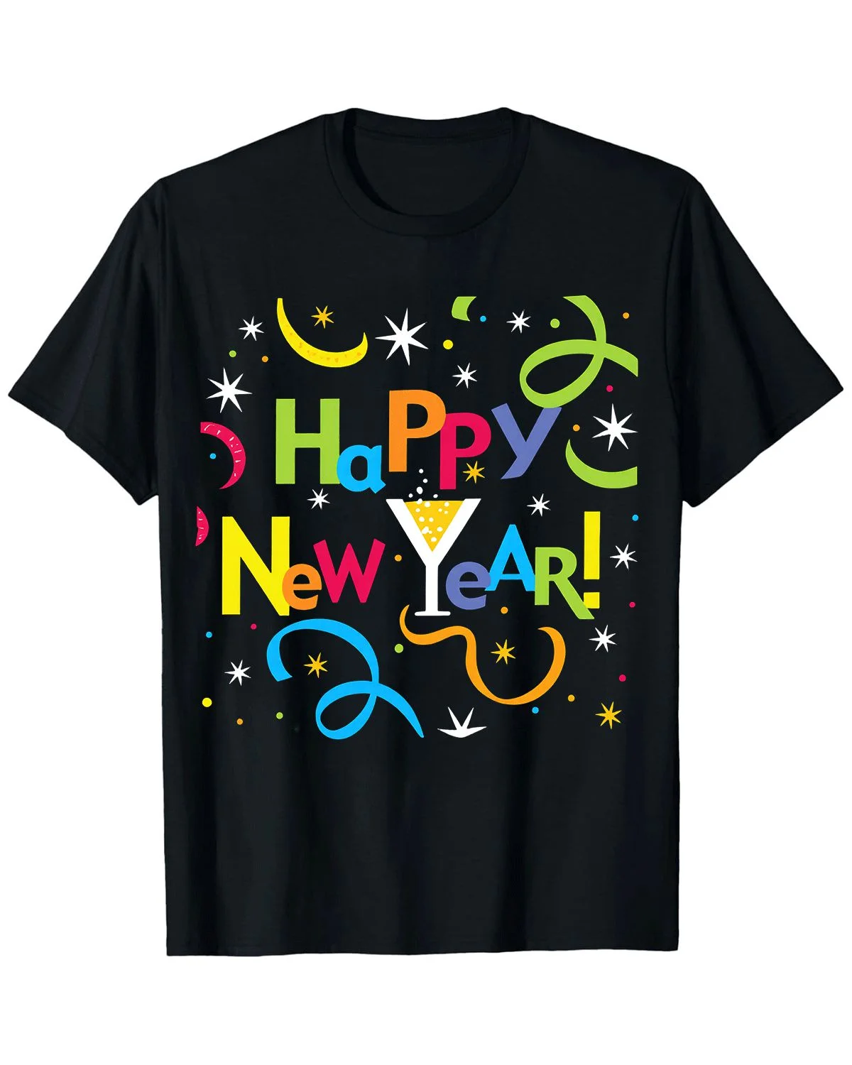 Happy New Year Colorful Letters and Confetti Summer Cotton Graphic T Shirt - Graphic Trendy, Short Sleeve, Soft Fabric, Comfortable Fit