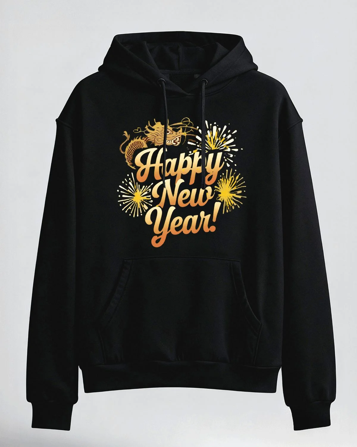 Happy New Year Dragon and Fireworks Cozy Graphic Hoodie for Men and Women - Vintage Artistic, Long Sleeve, Soft Fabric, Comfortable Fit