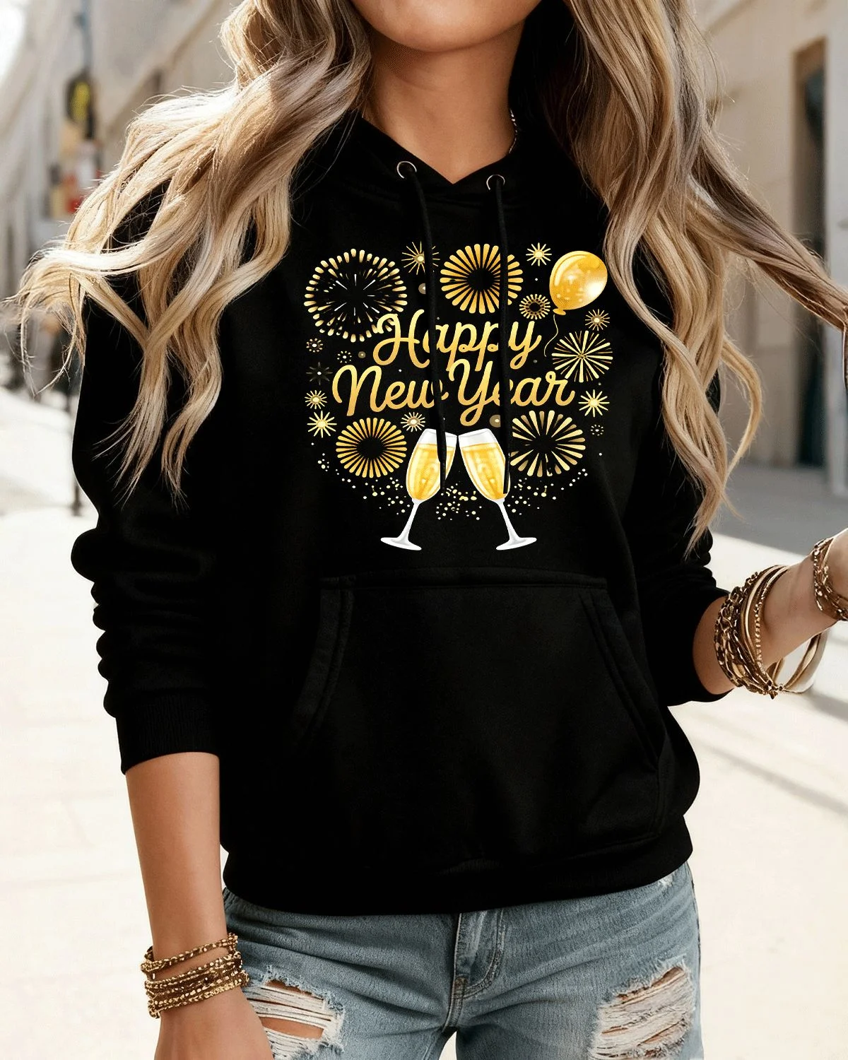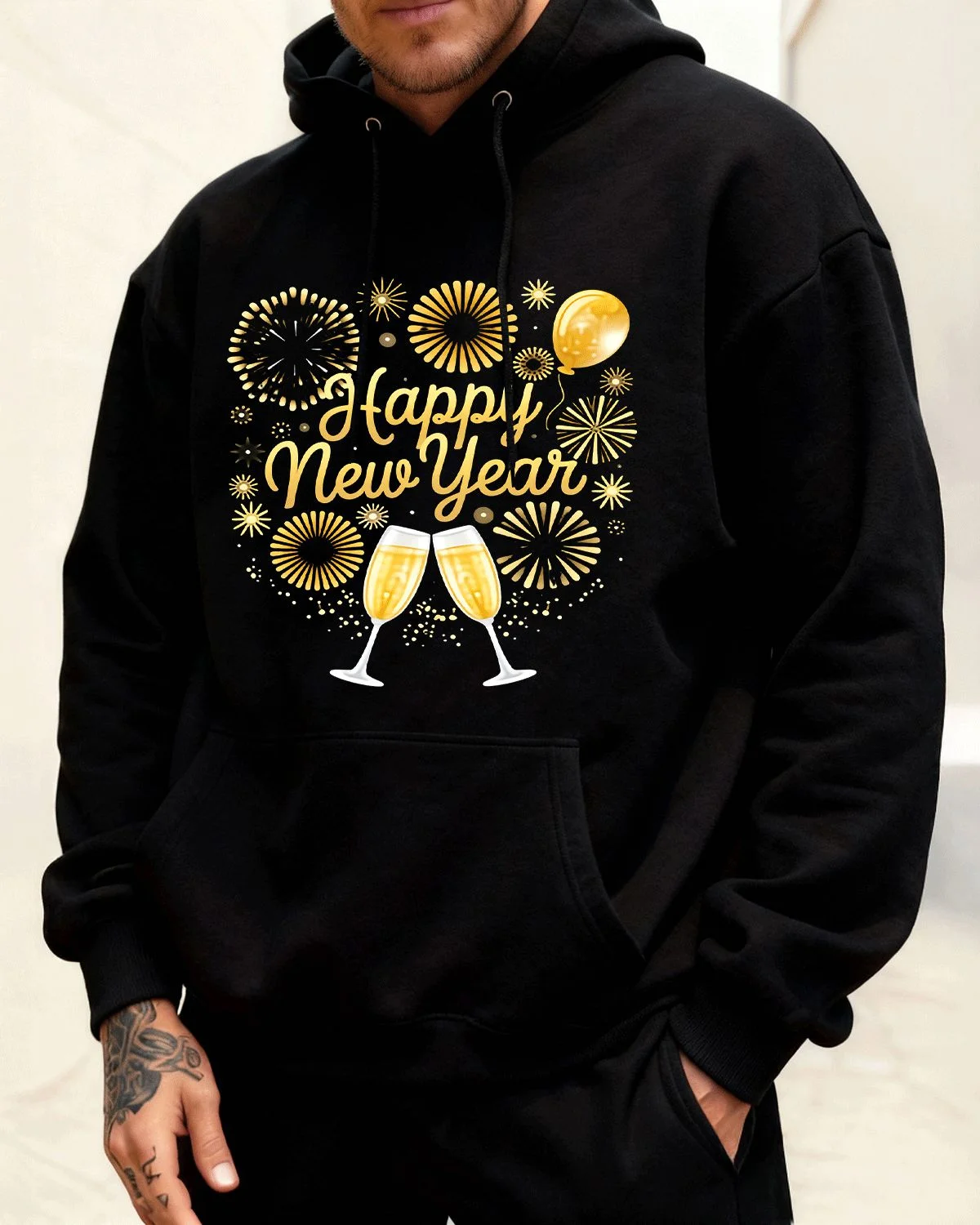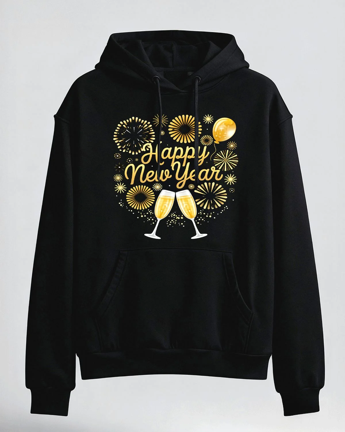 Happy New Year Fireworks and Champagne Cozy Graphic Hoodie for Men and Women - Festive Classic, Long Sleeve, Soft Fabric, Comfortable Fit