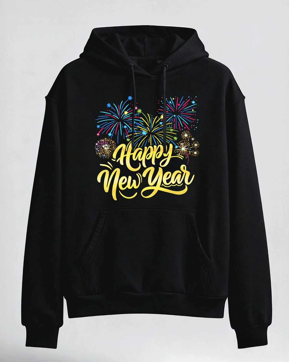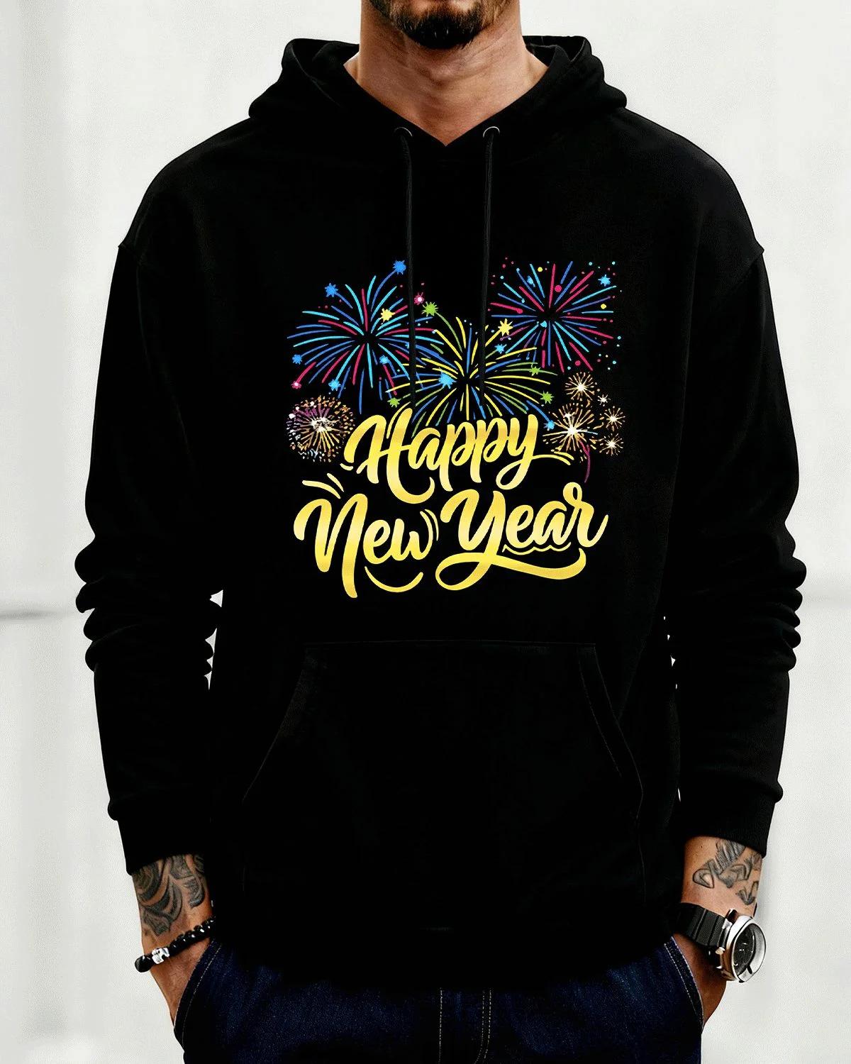 Happy New Year Fireworks Burst Cozy Graphic Hoodie for Men and Women - Casual Vintage, Long Sleeve, Soft Fabric, Comfortable Fit
