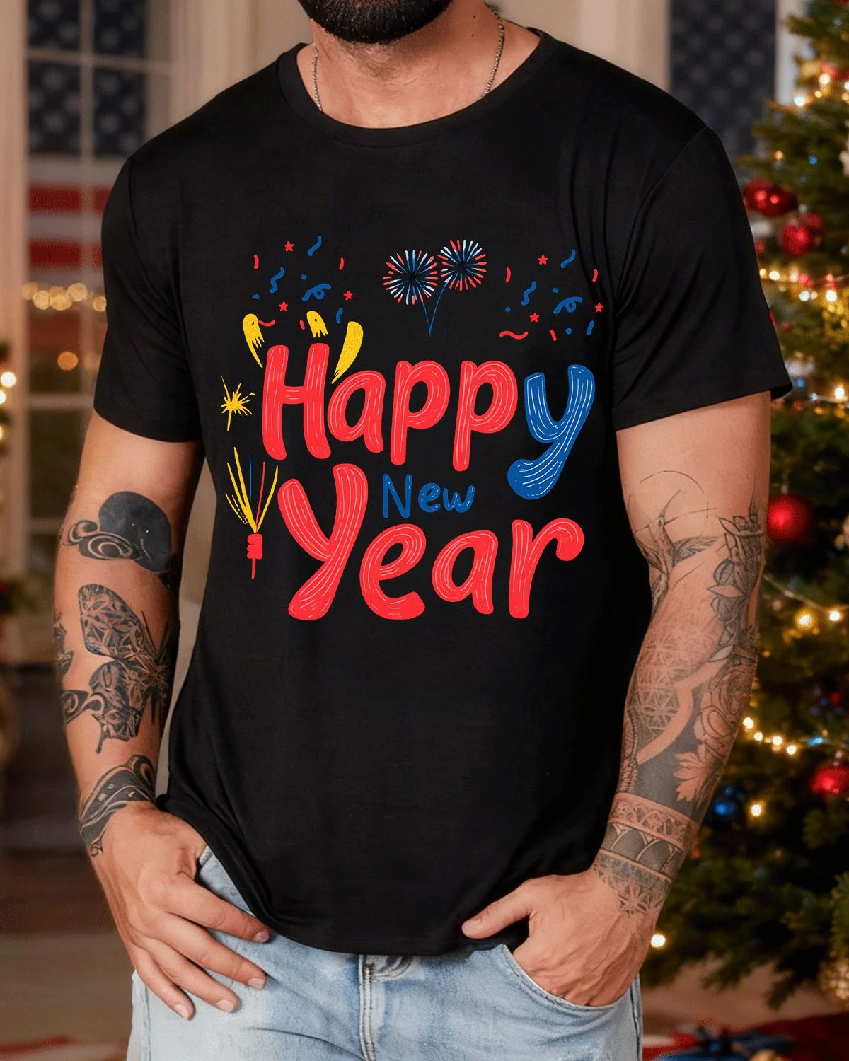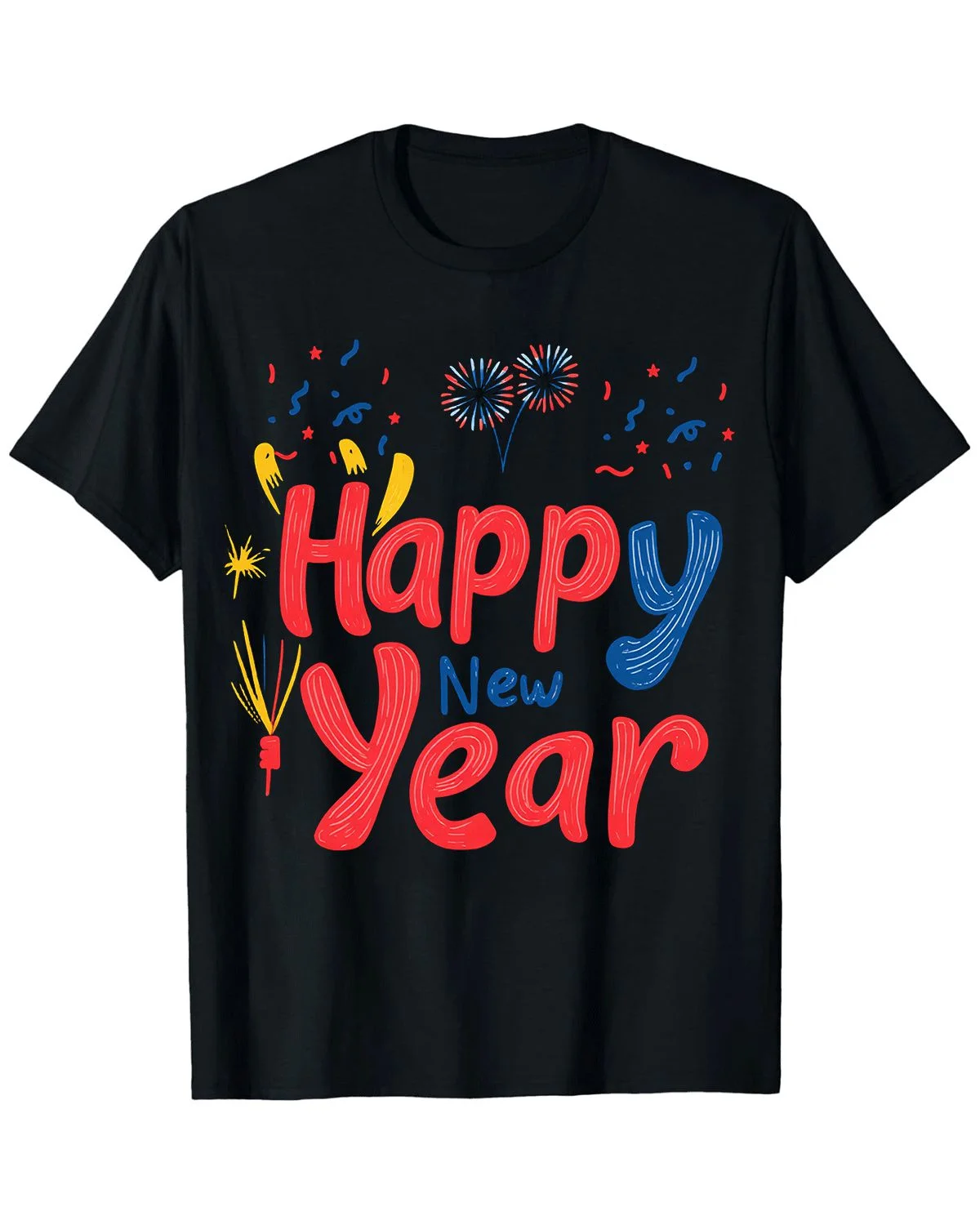 Happy New Year Confetti Celebration Summer Cotton Graphic T Shirt - Casual Vintage, Short Sleeve, Soft Fabric, Comfortable Fit